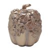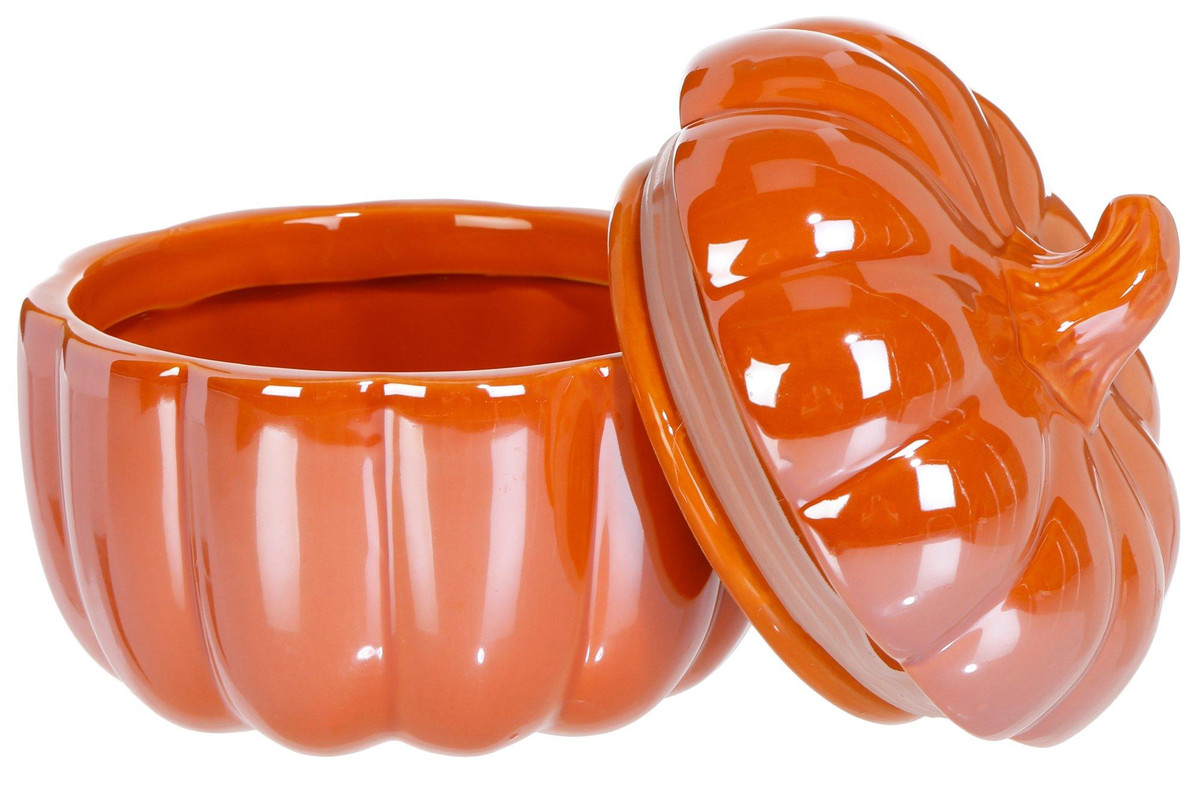 Add seasonal elegance to your table with this 5 in Shiny Pumpkin Sugar Pot with Lid. Crafted from ceramic with a glossy finish, it features a functional lid and a charming pumpkin shape. Ideal for serving sugar or storing small trinkets. Hand wash recommended for lasting beauty. Measures approximately 5 in round x 5 in.