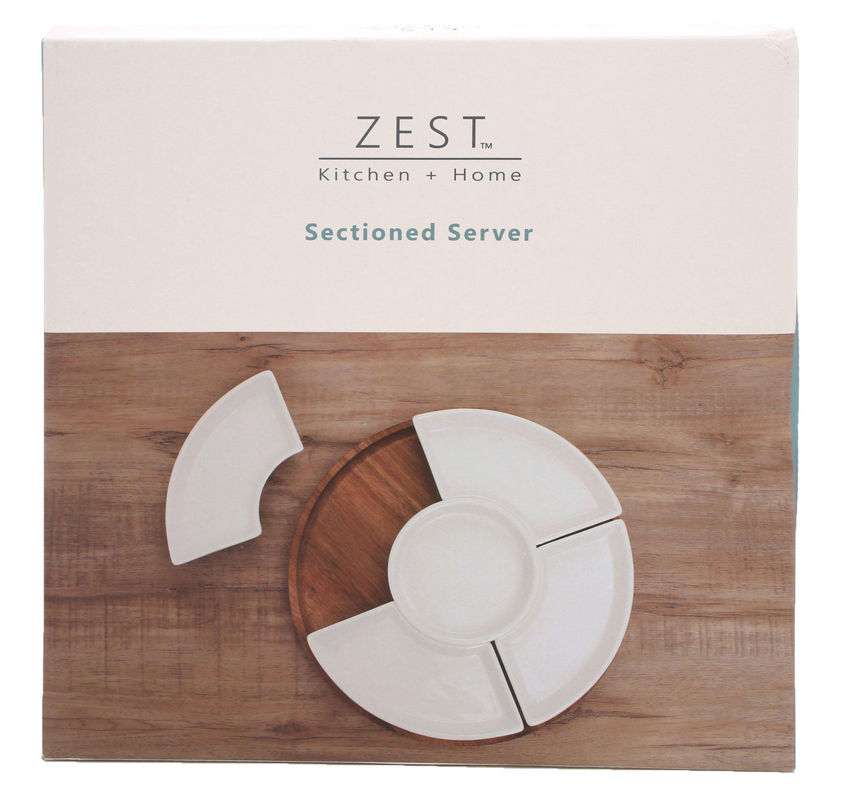 Zest Kitchen + Home produces sophisticated home products and textiles with an international sense of style and quality. This high-quality sectioned server tray features a sleek and modern wood base with five ceramic plate sections. Measures 11-3/4in x 11-3/4in x 1-3/4in.