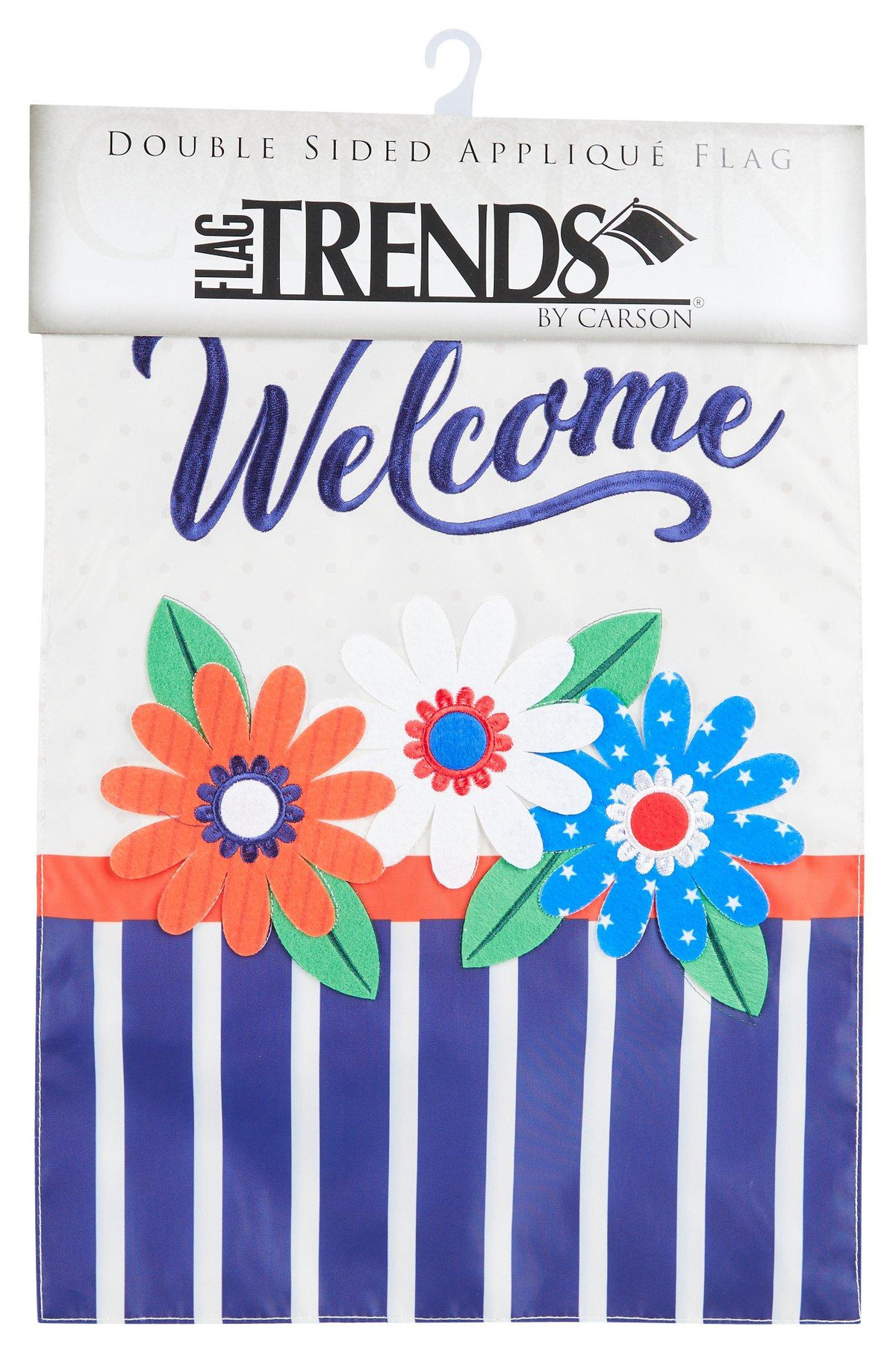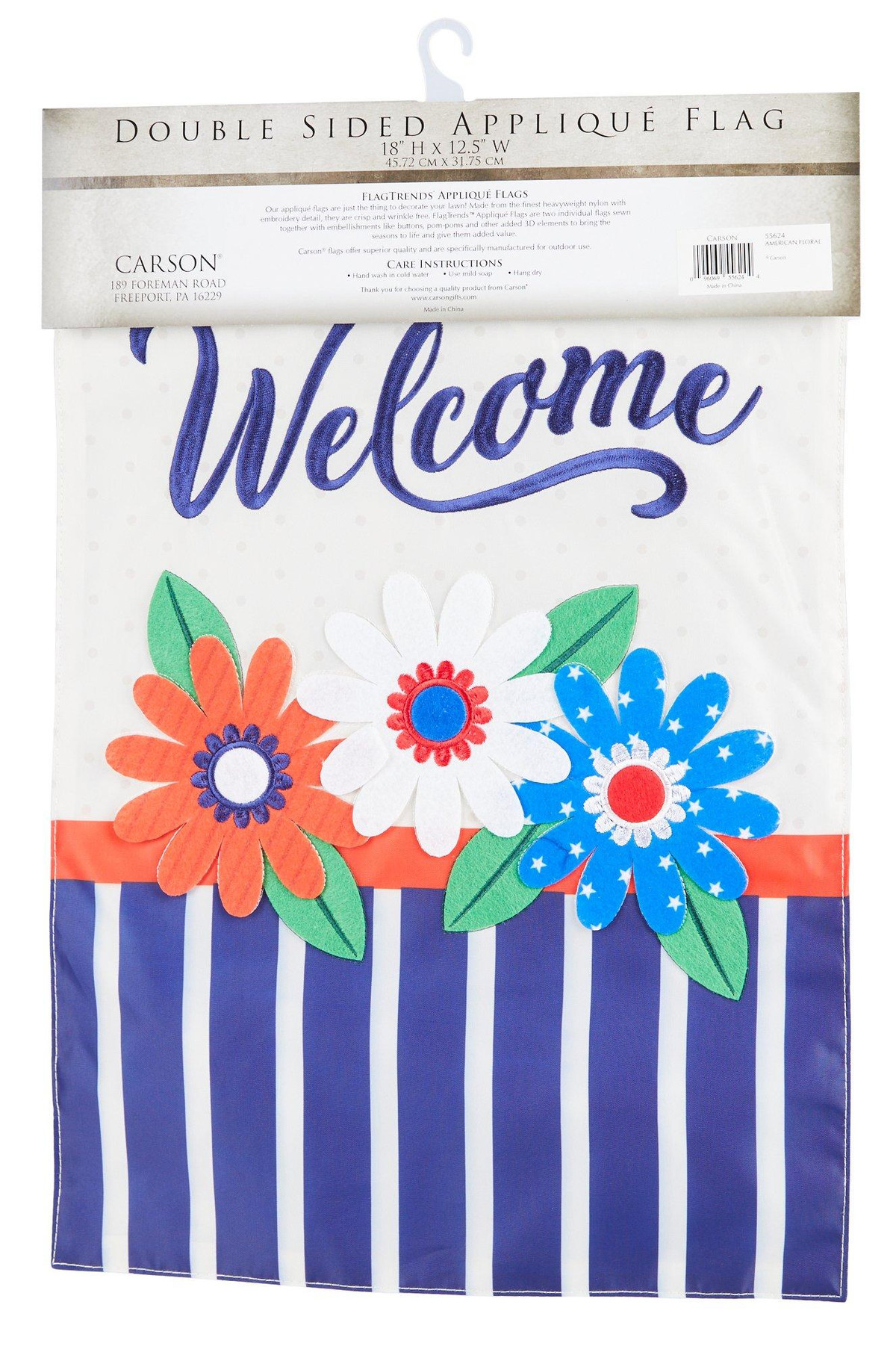 Add a warm and inviting touch to your outdoor space with the 12×18 Double Sided Americana Floral Welcome Garden Flag featuring colorful flowers over a navy and white striped background and the word ”Welcome” across the top. It’s crafted from heavyweight nylon material and has beautiful contrasting stitching and 3D embroidered details. Outdoor safe and ready to hang on the door or wall using ribbon.