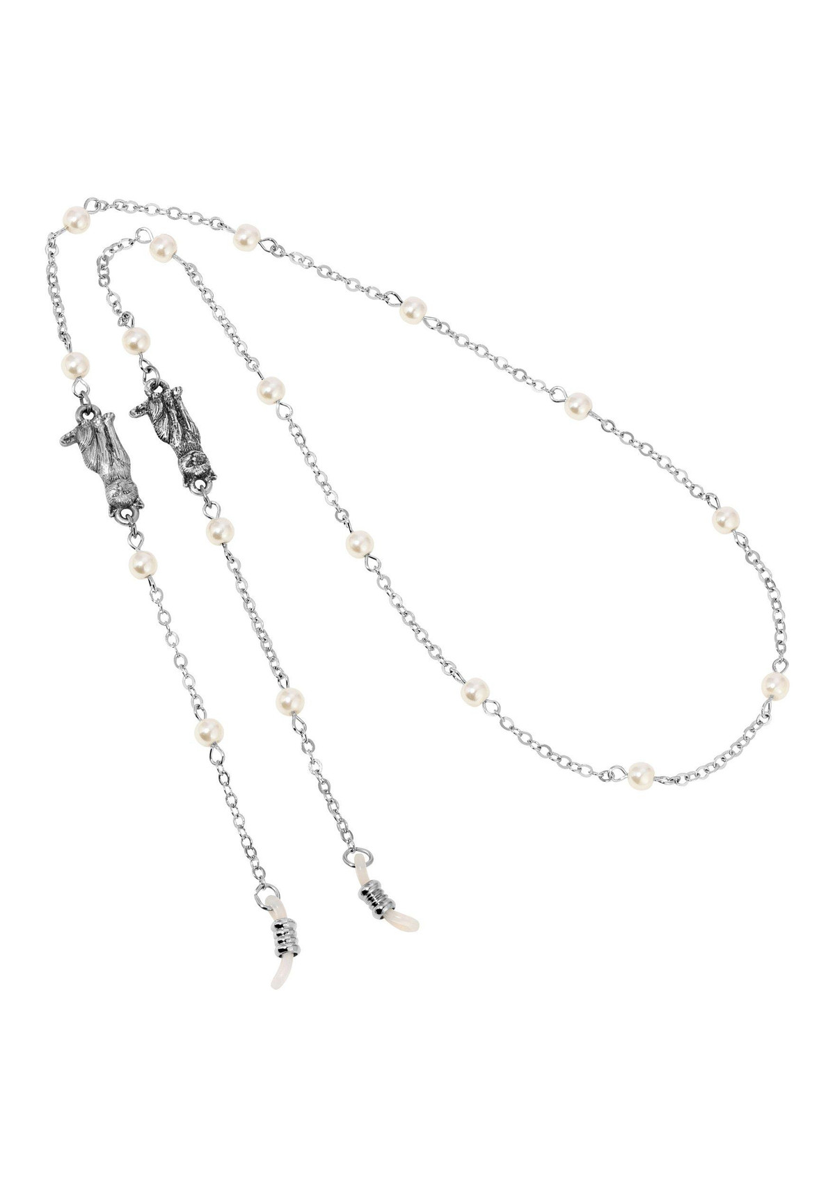 Keep your glasses stylishly within reach with this elegant necklace. Featuring smooth, round beads adorned with charming cats, this chic eyeglasses or sunglasses holder rests gracefully on a silver-tone chain. Avoid stretching your shirts by hanging your glasses from this fashionable accessory, ensuring both convenience and style in one beautiful piece. Length 26 in., width 13 mm.