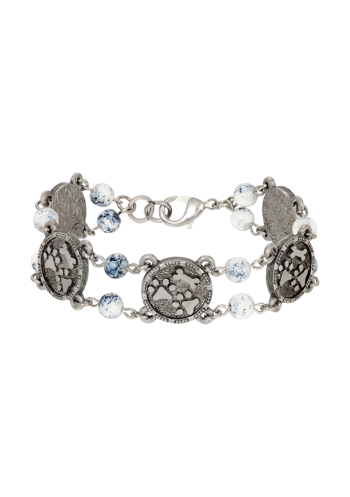 This charming bracelet showcases a playful design with round links of paws and bones, interspersed with connecting beads that add a touch of elegance. The lobster clasp ensures a secure fit while adding a classic touch. Perfect for celebrating your love for pets with style and sophistication, this bracelet is both fun and refined, making it an ideal accessory for any pet lover. Length 7.5 in., width 18 mm.
