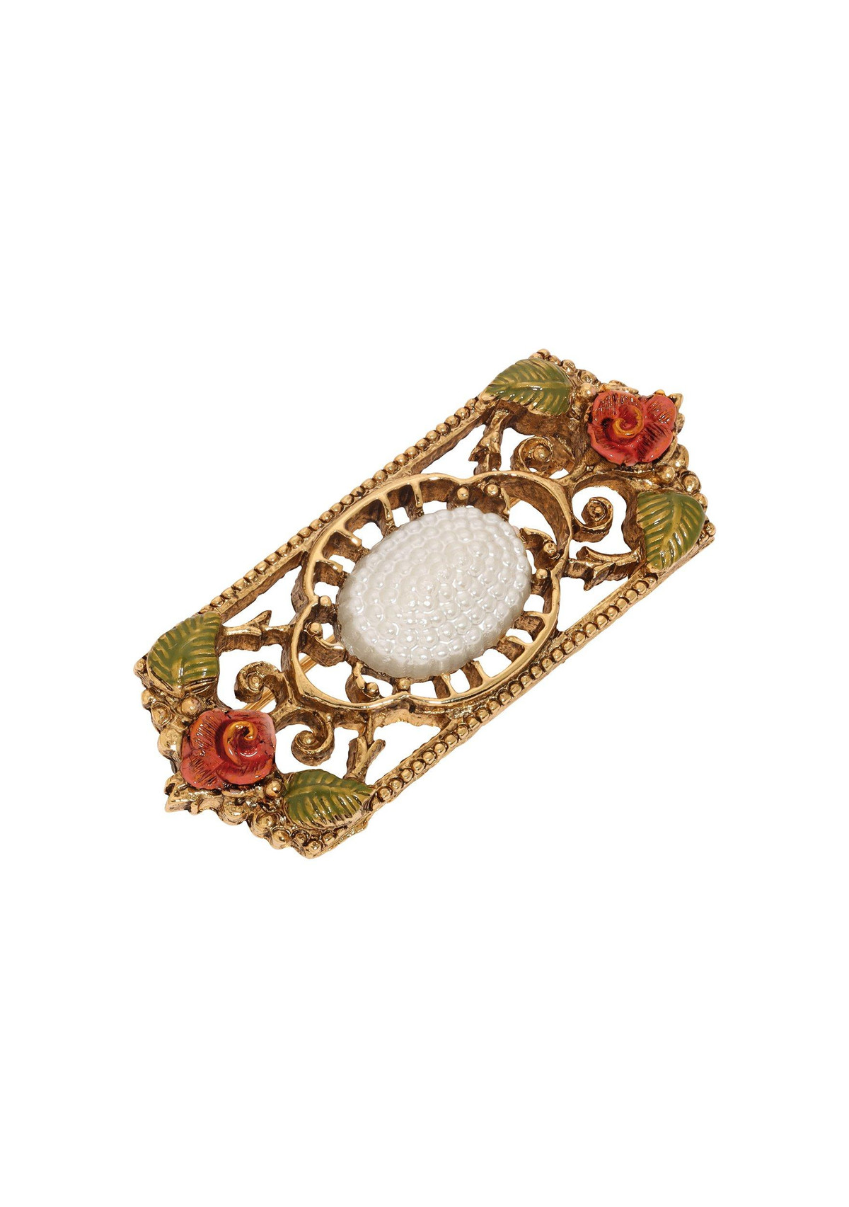 This 1928 Jewelry brooch features a faux pearl center framed by a 14K gold-dipped filigree setting. Hand-enameled red roses and green leaves accent each corner, adding vintage floral charm. With a secure pin back, it is a timeless accessory for elegant, classic style. Length 1.8 in., width 16mm.