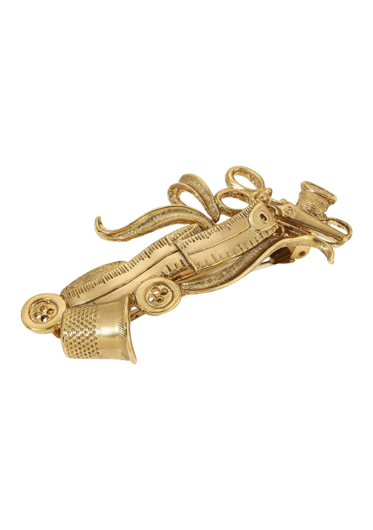 This hair barrette boasts a captivating array of miniature seamstress symbols including a thimble, measuring tape, scissors, thread, and round buttons, evoking a charming ode to the art of sewing. Length 3 in., width 35mm.