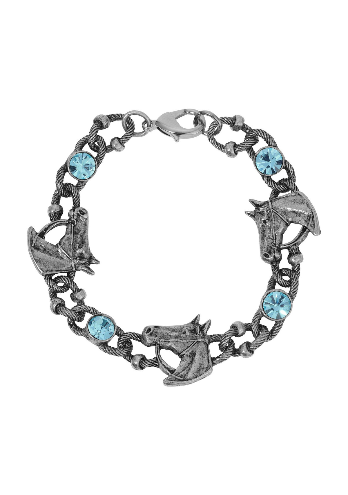 This rope link bracelet showcases a striking blend of equestrian charm and refined craftsmanship, with horse heads seamlessly linked and features aqua blue European crystals. The textured rope-style links create depth, while the vibrant crystals add a refreshing pop of color. Length 7.25 in., width 25 mm.