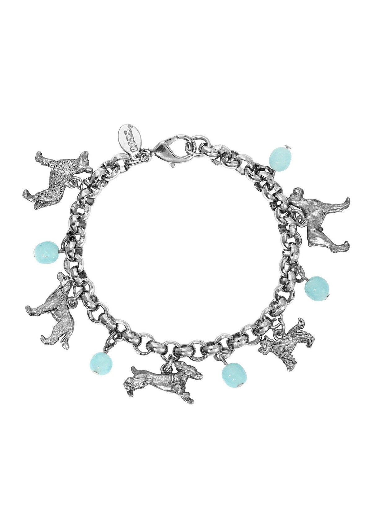 This charming round steel link bracelet boasts aqua blue baroque glass beads nestled between adorable dog charms, showcasing breeds like Husky, Labrador, Dachshund, Yorkshire, and Boxer. Each link tells a story, combining elegance with whimsy as it wraps around the wrist. Length 7.75 in., width 15mm.