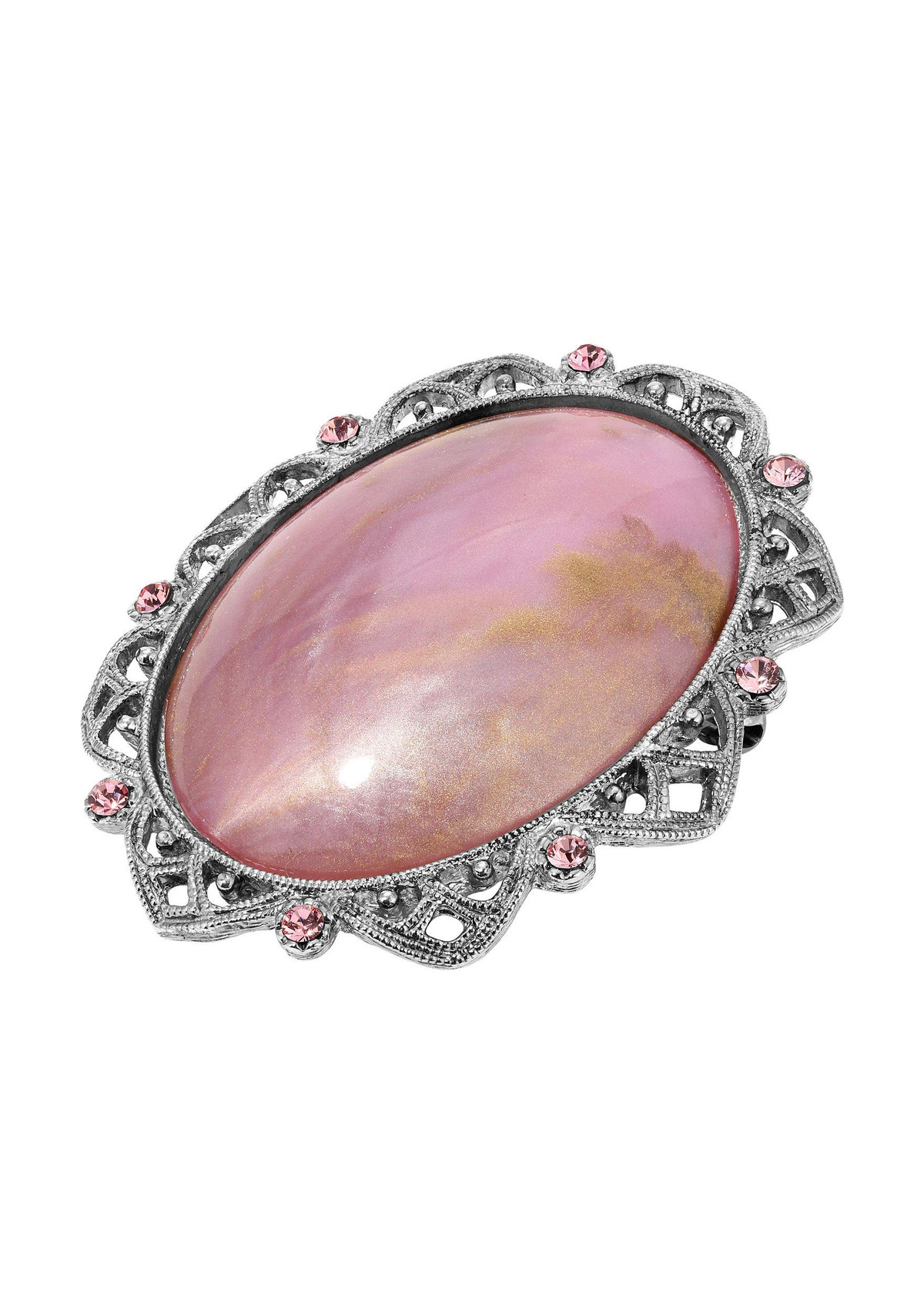 This antique-inspired brooch captivates with its delicate arrangement of light rose pink crystals encircling a smooth pink moonstone, all set against a backdrop of gleaming gold. Evoking an era of grace and refinement, it exudes a subtle charm that effortlessly complements any attire. Length 2 in., width 41mm.
