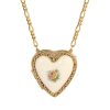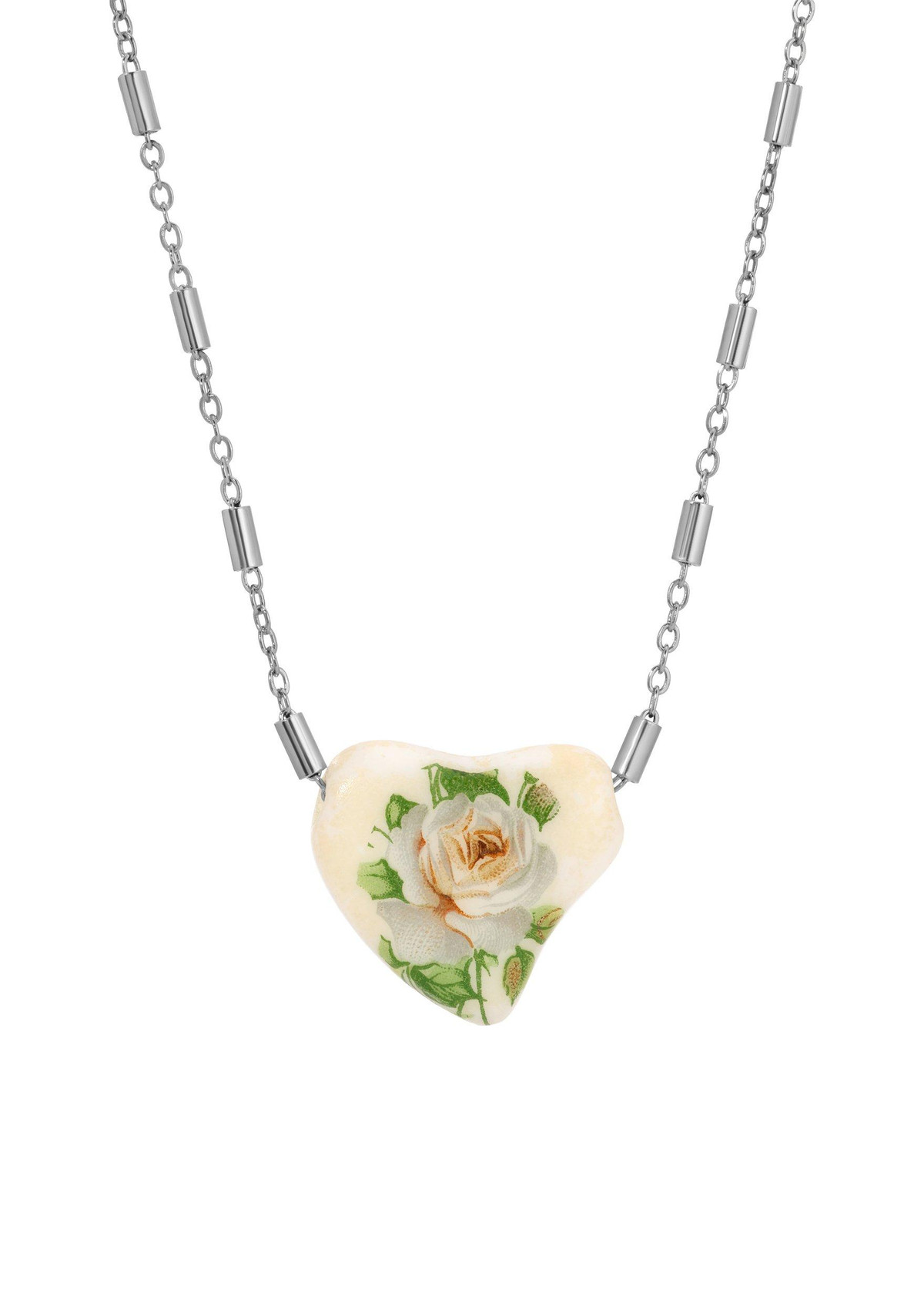 Whispers of the past bloom anew in this 1928 Jewelry White Heart Flower Necklace. A porcelain heart from 1985 cradles a delicate rose, its petals frozen in time. Suspended on a chain with vintage grace, its a soft echo of romance and memory. Perfect for those who wear history close to the heart. Length 15 in., width 25mm.
