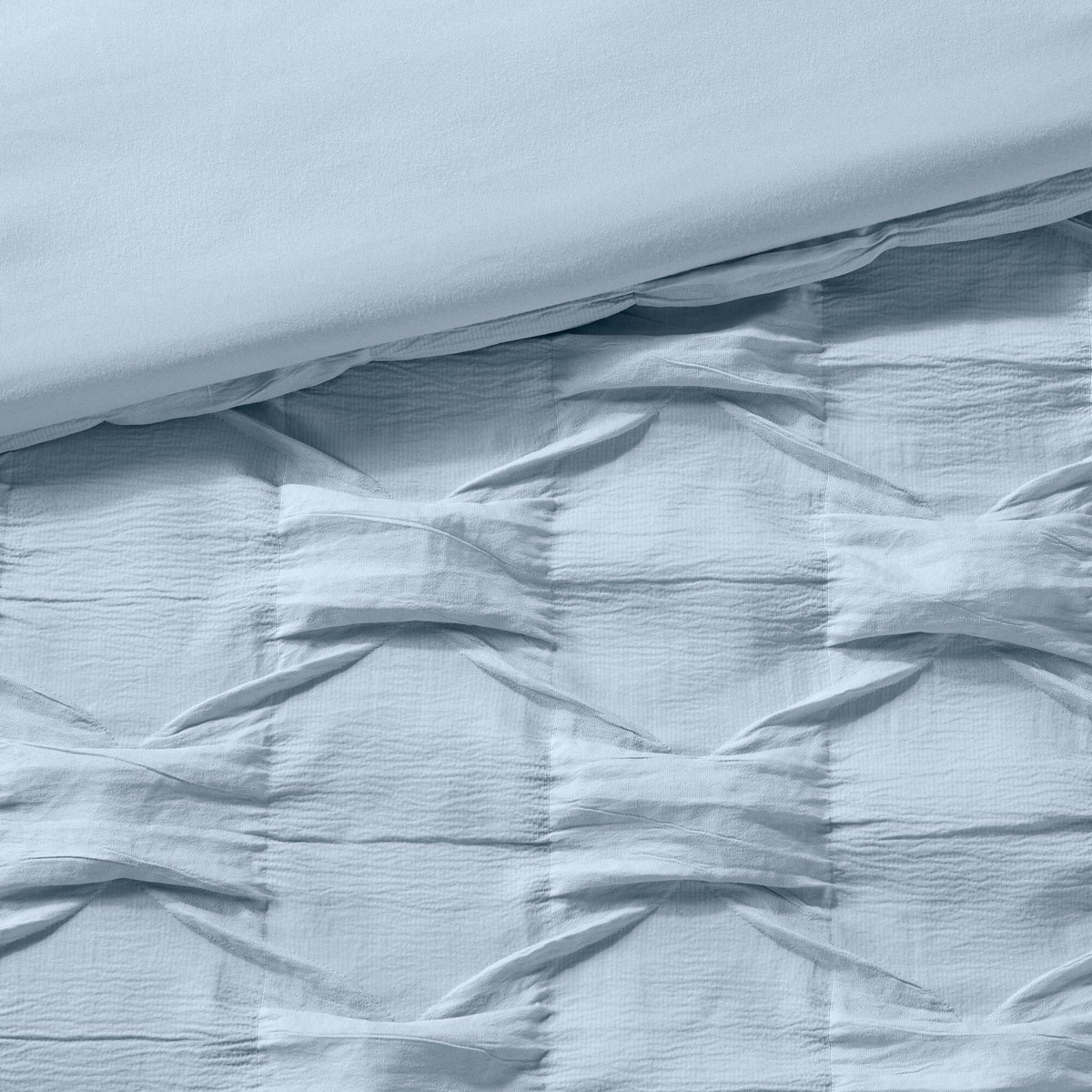 Add cozy elegance to your bedroom with this 510 Design Bailey Woven Comforter Ser. Featuring vibrant colors and ruched ogee crinkle-textured fabric, it is OEKO-TEX certified for wellness and filled with lightweight polyfill for year-round comfort. Includes a bonus 16 in. x 16 in. decorative pillow for a stylish touch.