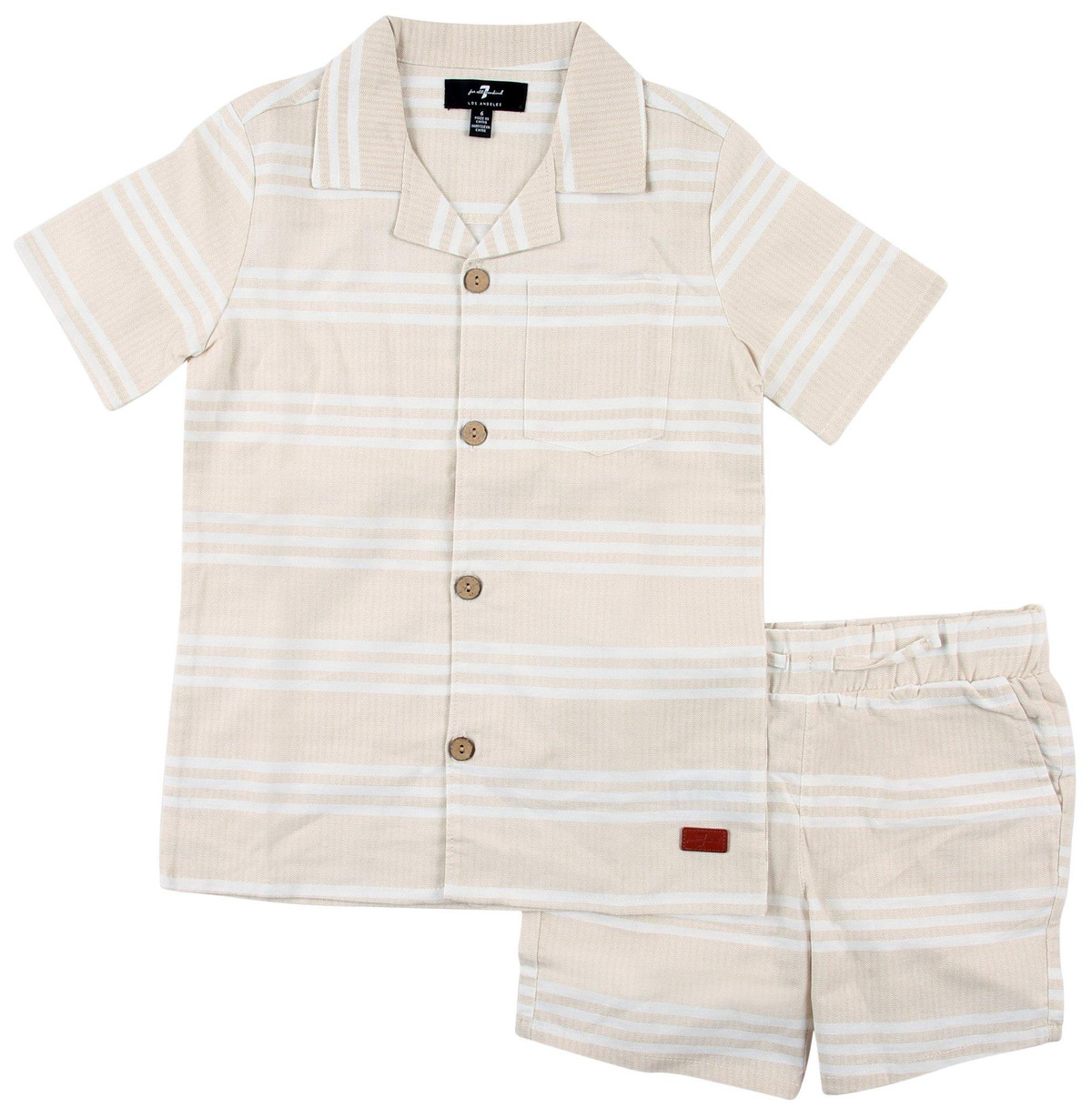 Keep him cool and comfy in this cotton-linen 2-piece set, perfect for warm days. The short-sleeve top features a notched collar, full button front, chest pocket, and a logo patch at the hem for a classic look. The coordinating shorts have an elastic waistband, decorative drawstring, two side pockets, and two back pockets with logo accentscombining everyday ease with a touch of style. Machine washable for no-fuss care.