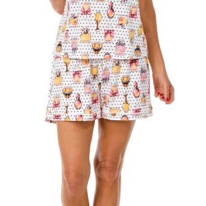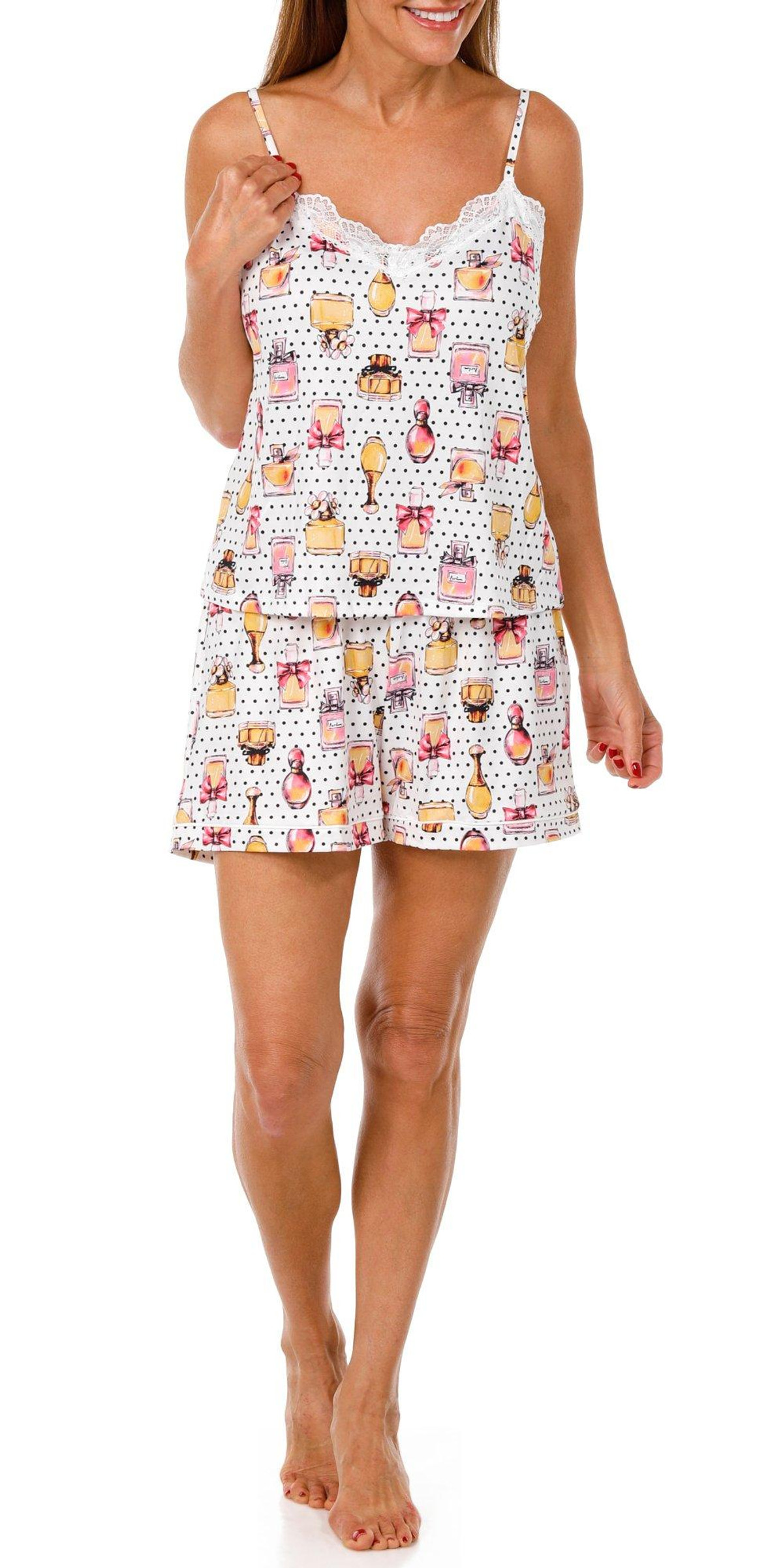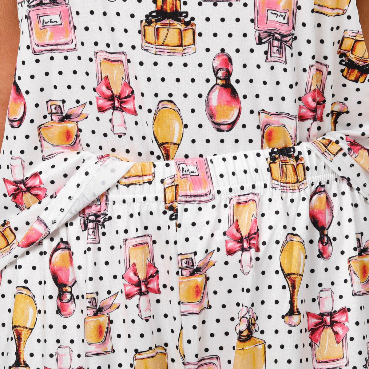 Sleep in style with this Women’s 2 Pc Perfume Print Sleepwear Set. Featuring a comfy cami and matching shorts, this set is adorned with a playful perfume and polka dot print. Light, breezy, and irresistibly cute for warm, cozy nights. Fabrication 95% polyester, 5% spandex