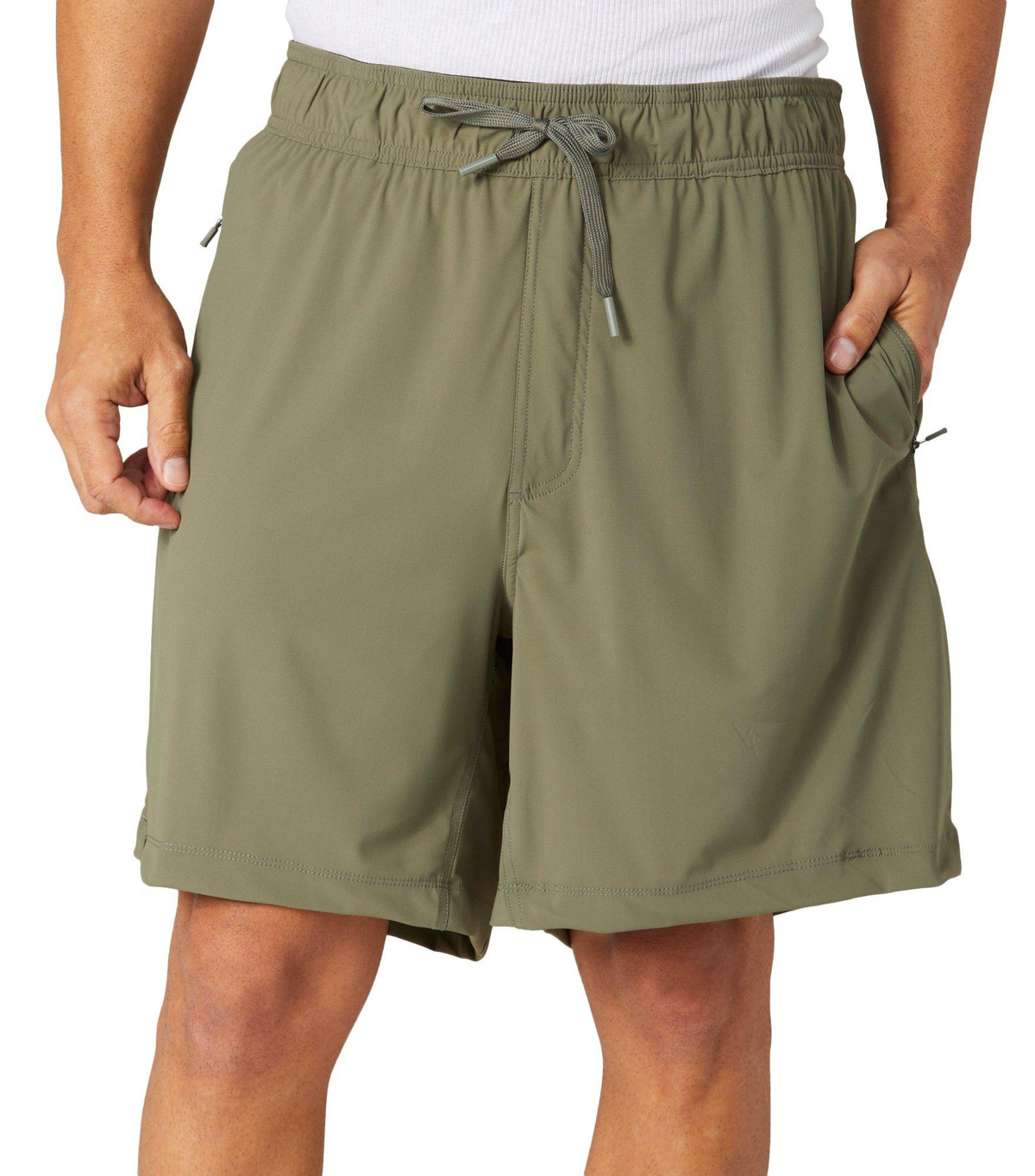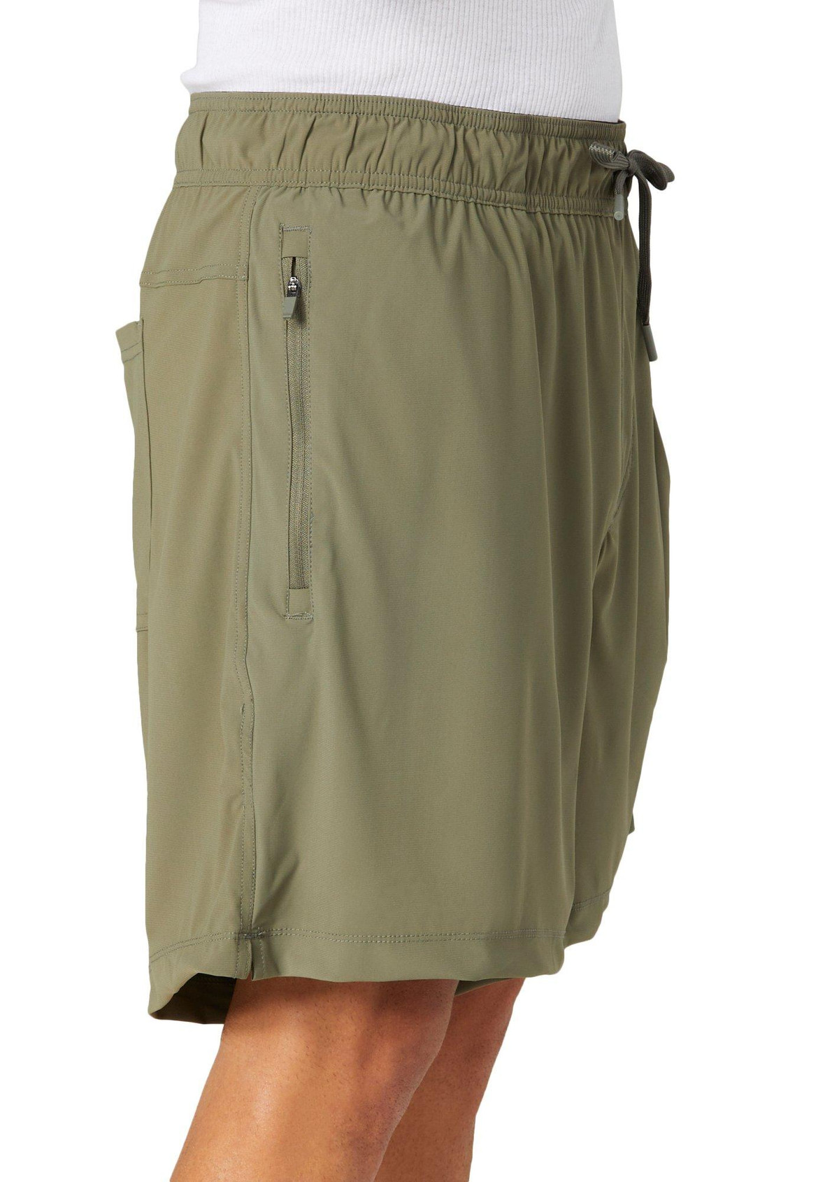 Introducing this pair of Mens Stretch Knit Athletic Shorts from 90 Degree by Reflex, designed for both style and functionality. Featuring a convenient drawstring waist for a perfect fit, these shorts come with double side zipper pockets and one back pocket. The fabric is breathable and lightweight, making them ideal for any activity indoor or outdoor. Embrace a blend of comfort and practicality with these versatile shorts, perfect for any active lifestyle.