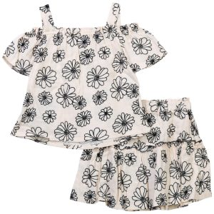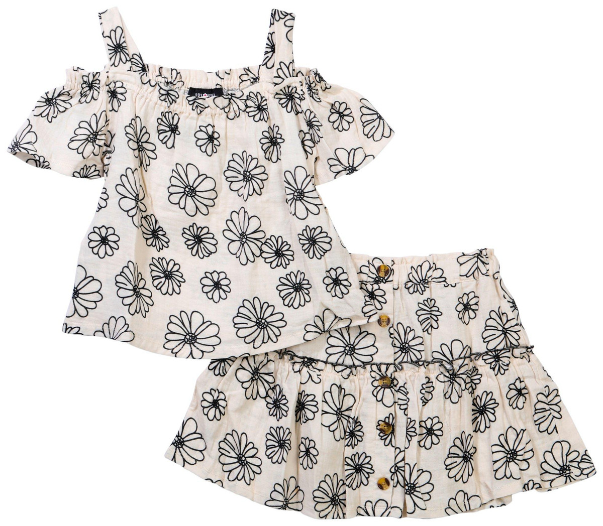 The Big Girls 2 Pc Daisy Skirt Set is a cheerful outfit featuring a cold shoulder top and a button down skirt. Adorned with an all over daisy print, this set blends playful charm with breezy style, perfect for sunny days and special outings. Fabrication 100% cotton