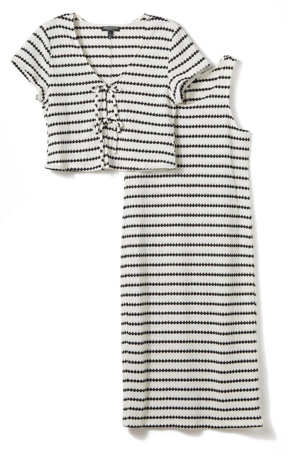 This womens 2 piece set includes a sleeveless dress and a short sleeve tie front bolero. Made with breathable material for comfort and style perfect for warm weather occasions and layered looks. Fabrication is 68% polyester, 23% cotton, 6% rayon, and 3% other fibers.