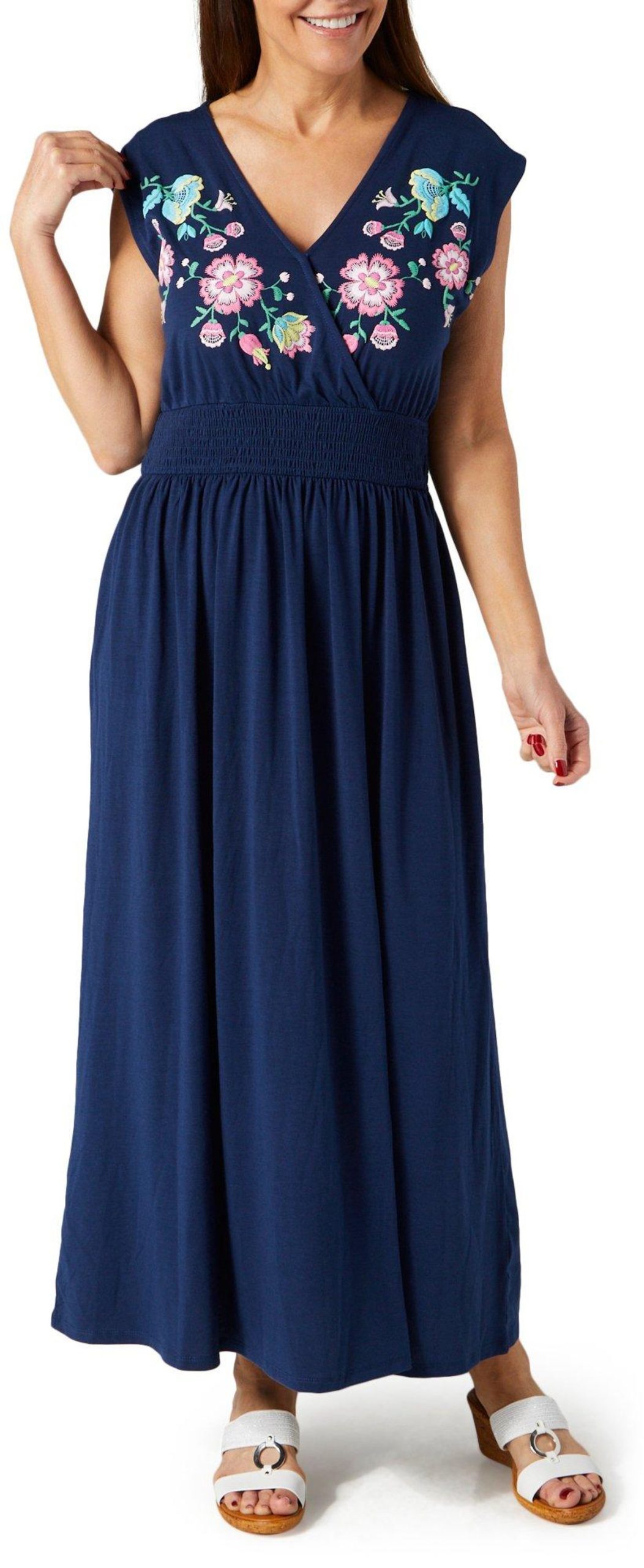 Elevate your style with our Women’s Embroidered Collar Maxi Dress. Crafted from a blend of polyester and spandex, this dress features a beautiful embroidered floral design on the collar and a sleeveless design. With a graceful 51-inch length, it combines elegance and comfort, making it perfect for any occasion.