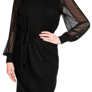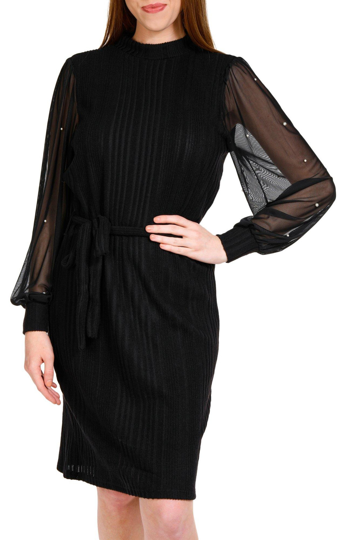 This Long Sleeve Mini Dress is a perfect blend of elegance and modern style. It features a chic mock neck and eye-catching pearl sleeve details that add a touch of sophistication. The mesh sleeves provide a unique and stylish twist, making this dress ideal for any occasion. Fabrication is 95% polyester, 5% spandex.