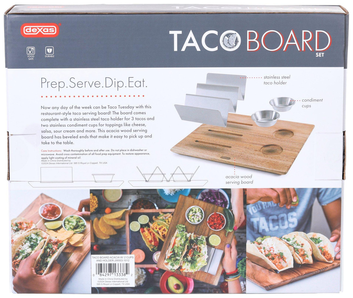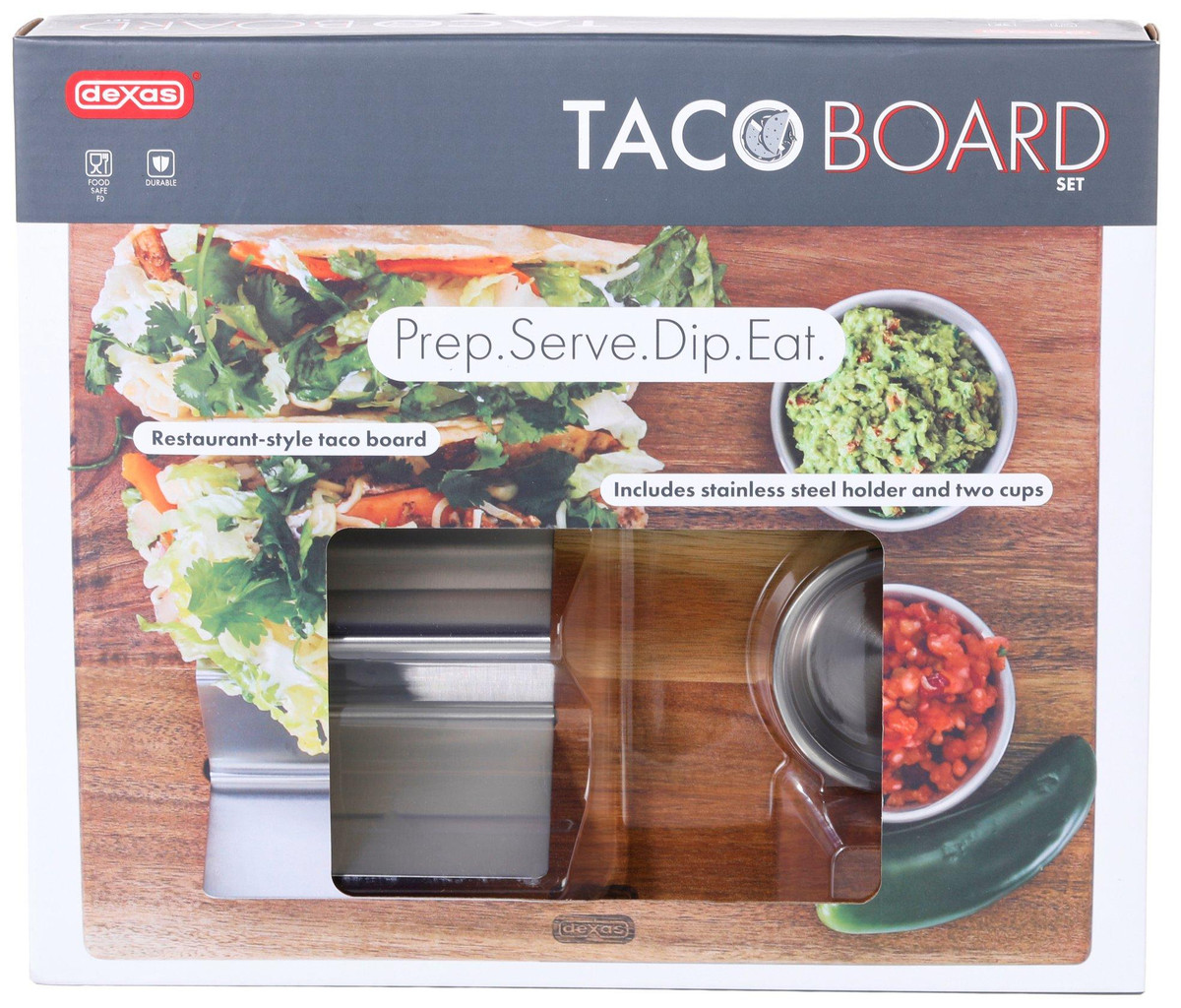 Any day can be Taco Tuesday with this restaurant syle taco serving board. Comes complete with a stainless steel holder for 3 tacos and condiment cups for toppings like cheese, salsa, sour cream and more. The acacia wood serving board has beveled ends that make it easy to pick up and take to the table.