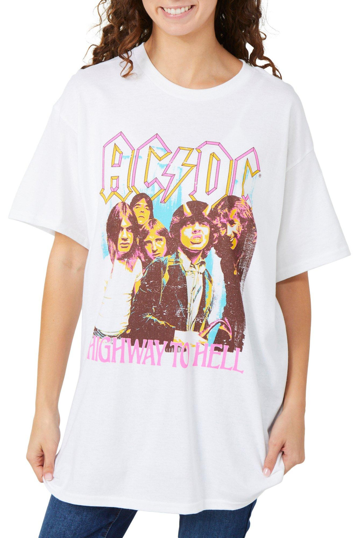 Rock out in the Juniors ACDC Highway Graphic Tee, featuring an iconic ACDC front graphic that amps up your look. With a classic crew neckline and short sleeves, it is a must-have for music lovers and vintage vibes. Fabrication 100% cotton.