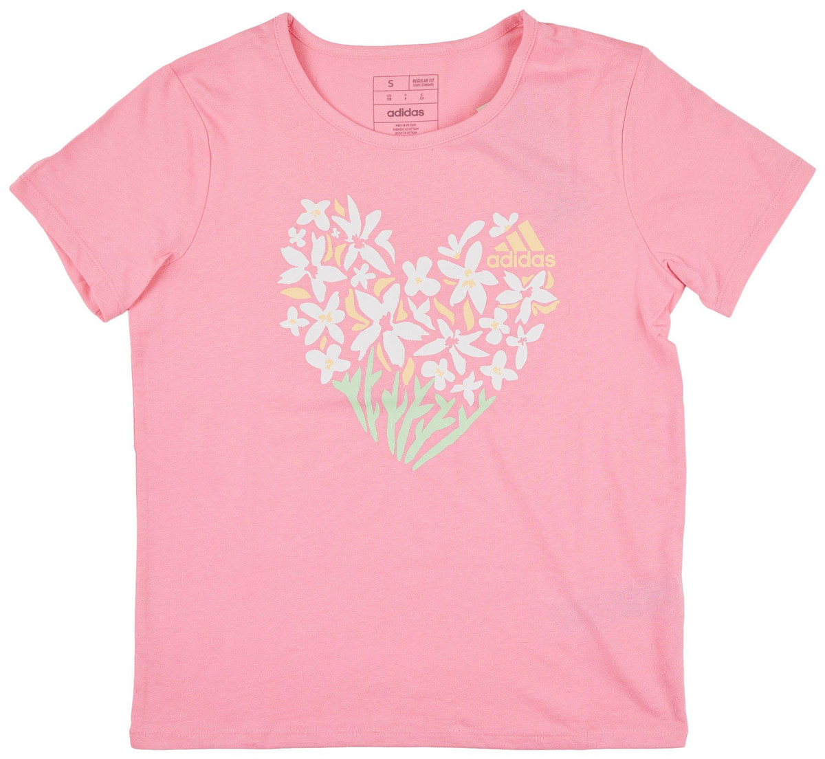This big girls active tee features a heart-shaped floral screen print, classic crew neckline, and short sleeves. Made from a soft cotton-polyester blend, it is a comfy and stylish choice for everyday adventures with a sweet, sporty touch. Fabrication is 60% cotton, 40% polyester
