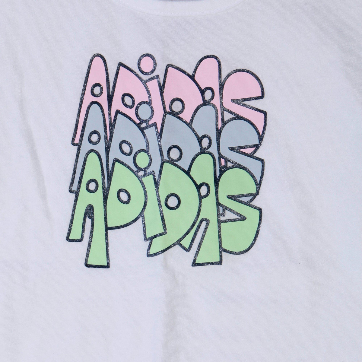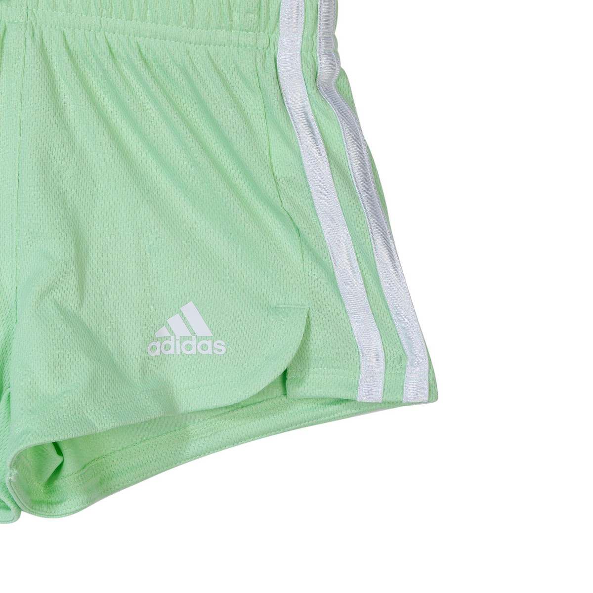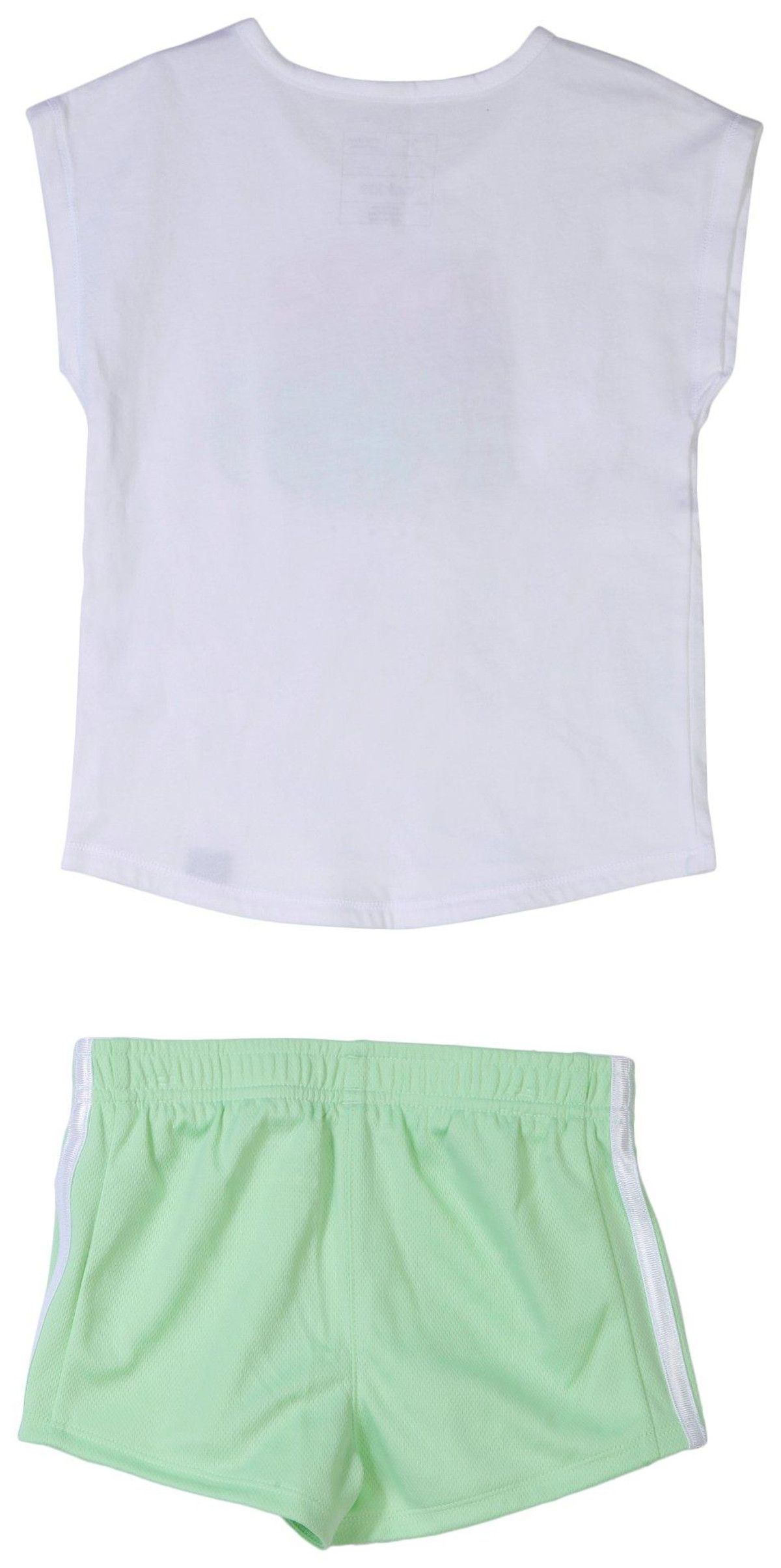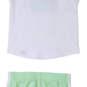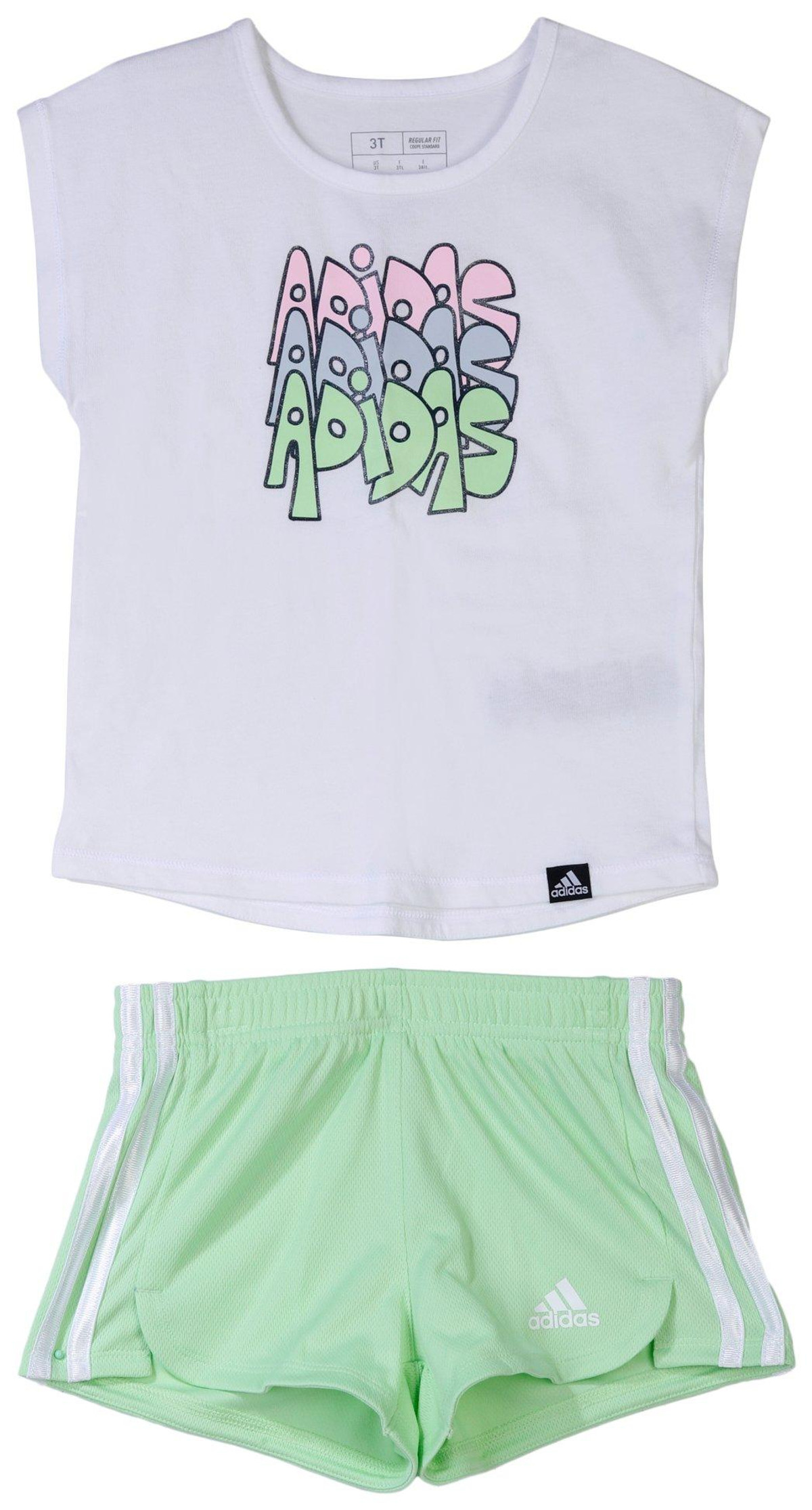 Add sporty style to her day with this Toddler Girls 2 Pc Active Shirt Shorts Set, featuring a 100% cotton shirt with a pastel stylized Adidas logo and mesh polyester shorts with side stripes. Designed for breathability and comfort. Ideal for playtime, outings, and warm-weather activities.