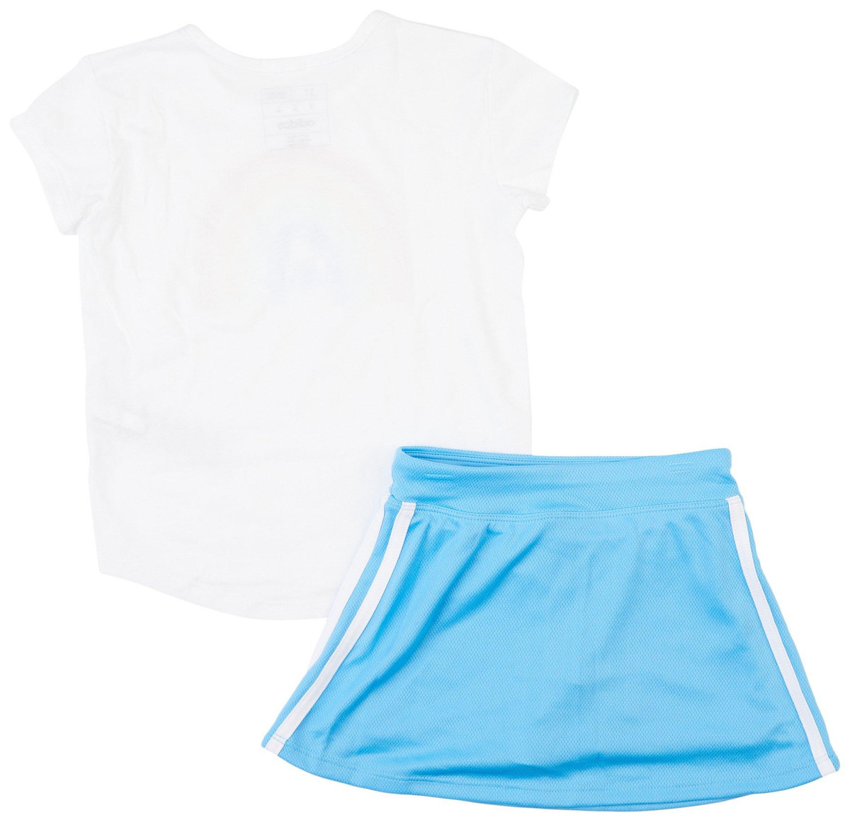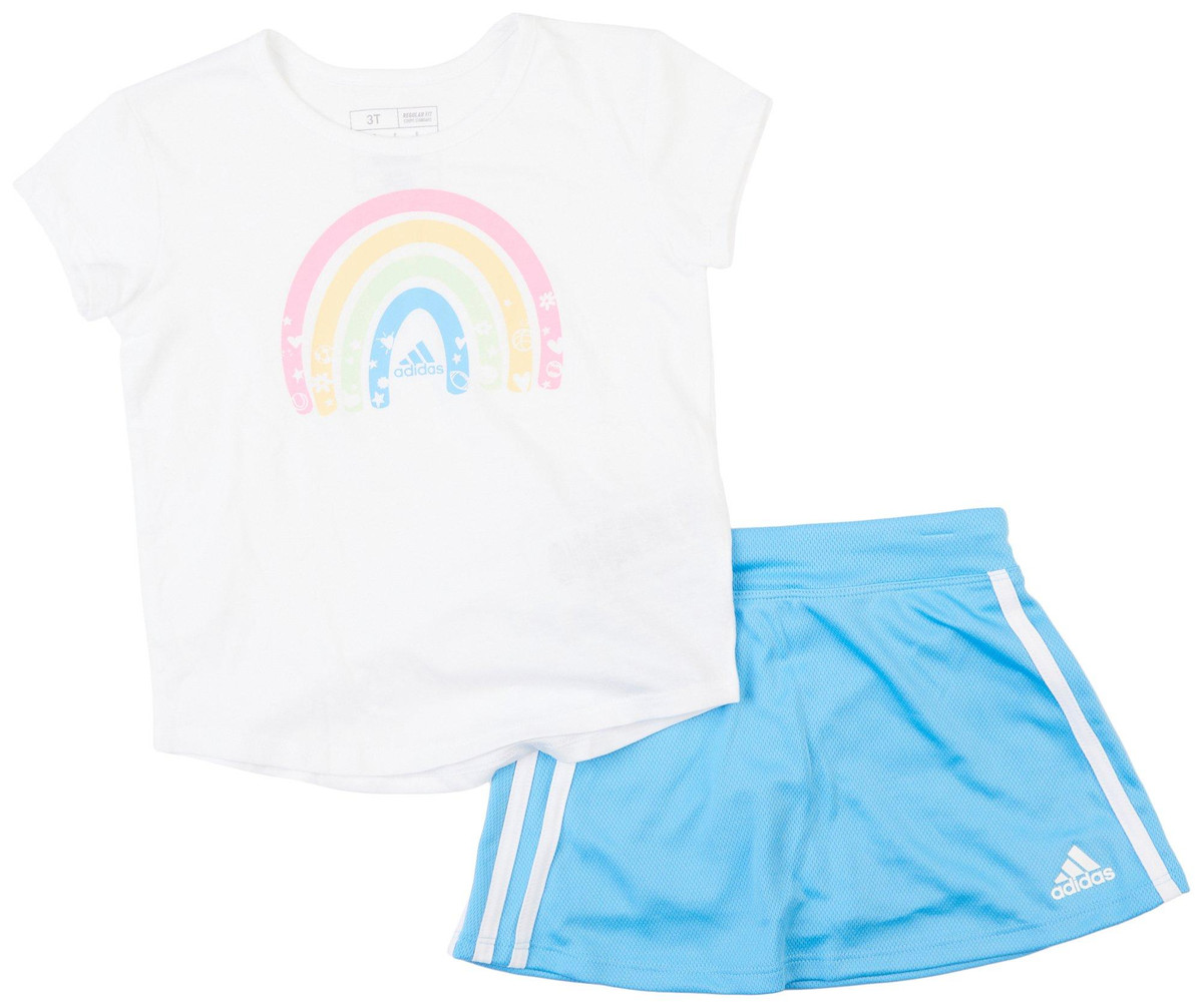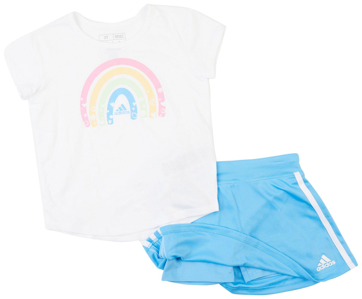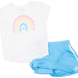 This adorable adidas toddler girls 2-piece set is perfect for active little ones who love sporty style with a playful twist. The soft cotton crew neck t-shirt features a cheerful rainbow graphic, while the lightweight polyester skort adds movement and flair with built-in shorts and signature adidas stripes. Finished with a bold fuchsia logo, this outfit is made for comfort, designed for fun, and ready for every adventure.