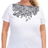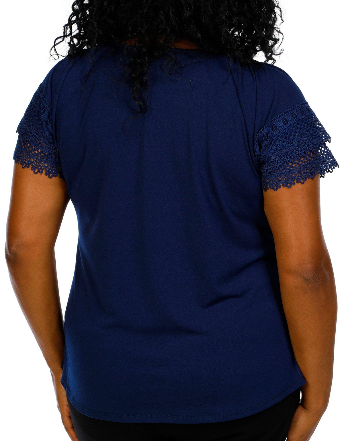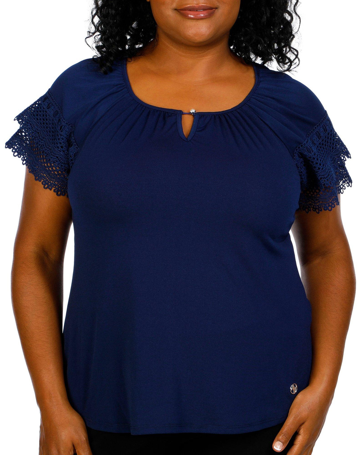 This plus size knit crepe top features a solid color with a keyhole neckline and short sleeves accented by subtle knit detail. Its polished look and comfortable fit make it an ideal choice for the workplace or everyday wear.