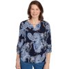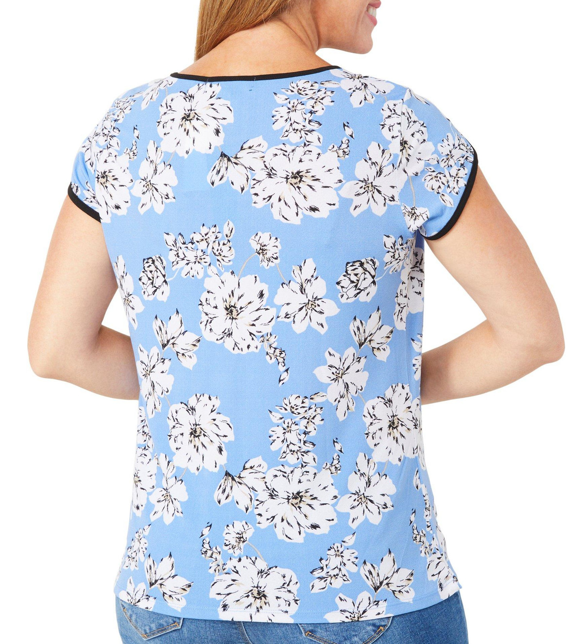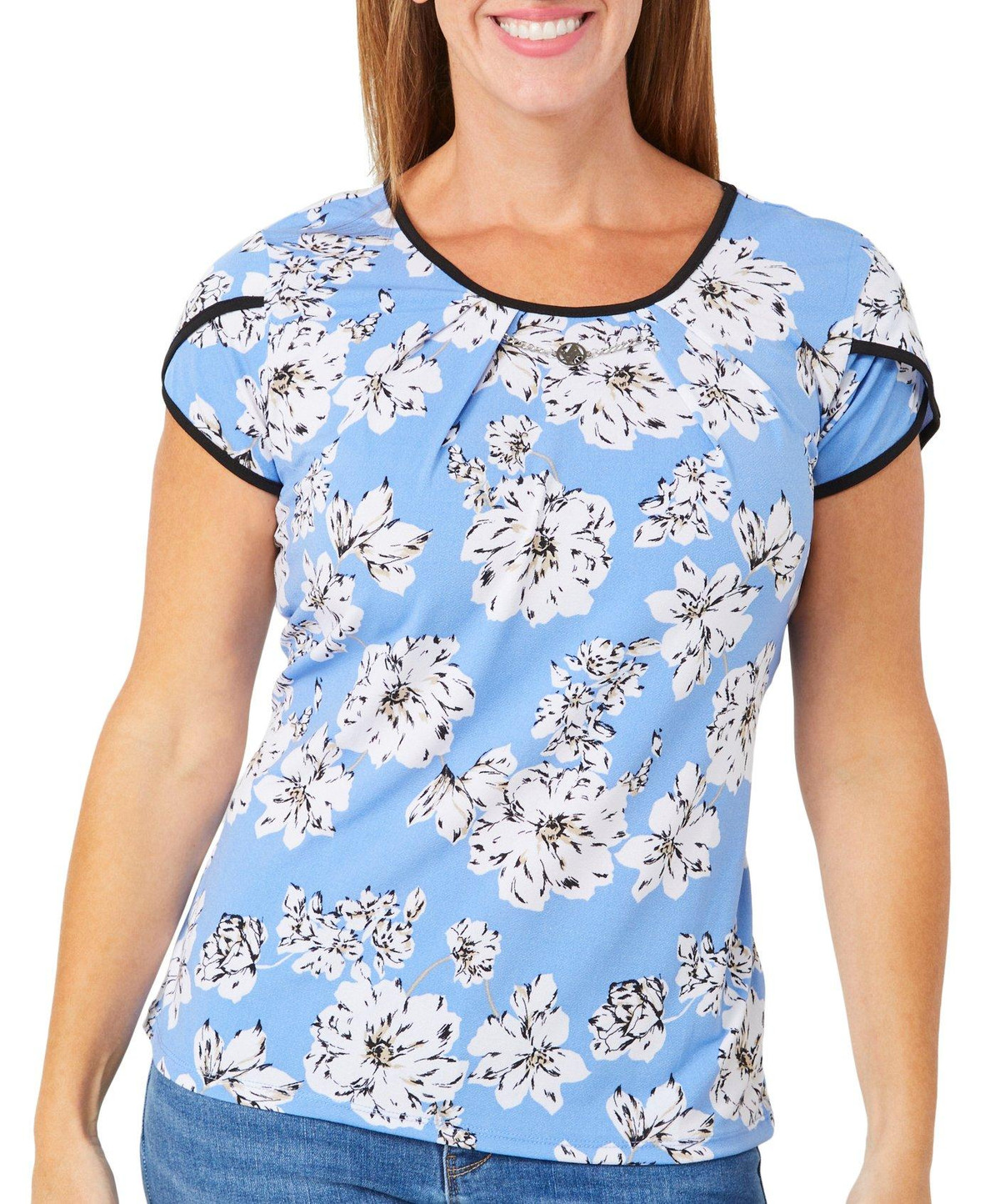 Freshen up your wardrobe with this Women’s Short Sleeve Tulip Print Top. Featuring a charming tulip print, its styled with short sleeves, a crew neckline with pleated detail, and silver chain accents for a touch of shine. Fabrication 95% polyester, 5% spandex