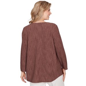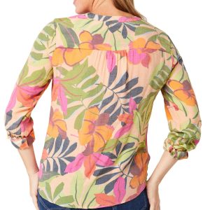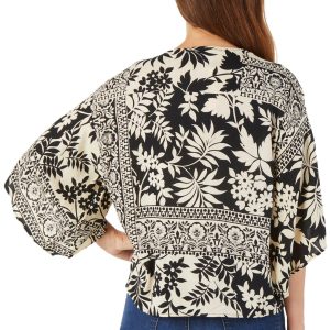 Freshen up your wardrobe with this Women’s Short Sleeve Tulip Print Top. Featuring a charming tulip print, its styled with short sleeves, a crew neckline with pleated detail, and silver chain accents for a touch of shine. Fabrication 95% polyester, 5% spandex