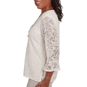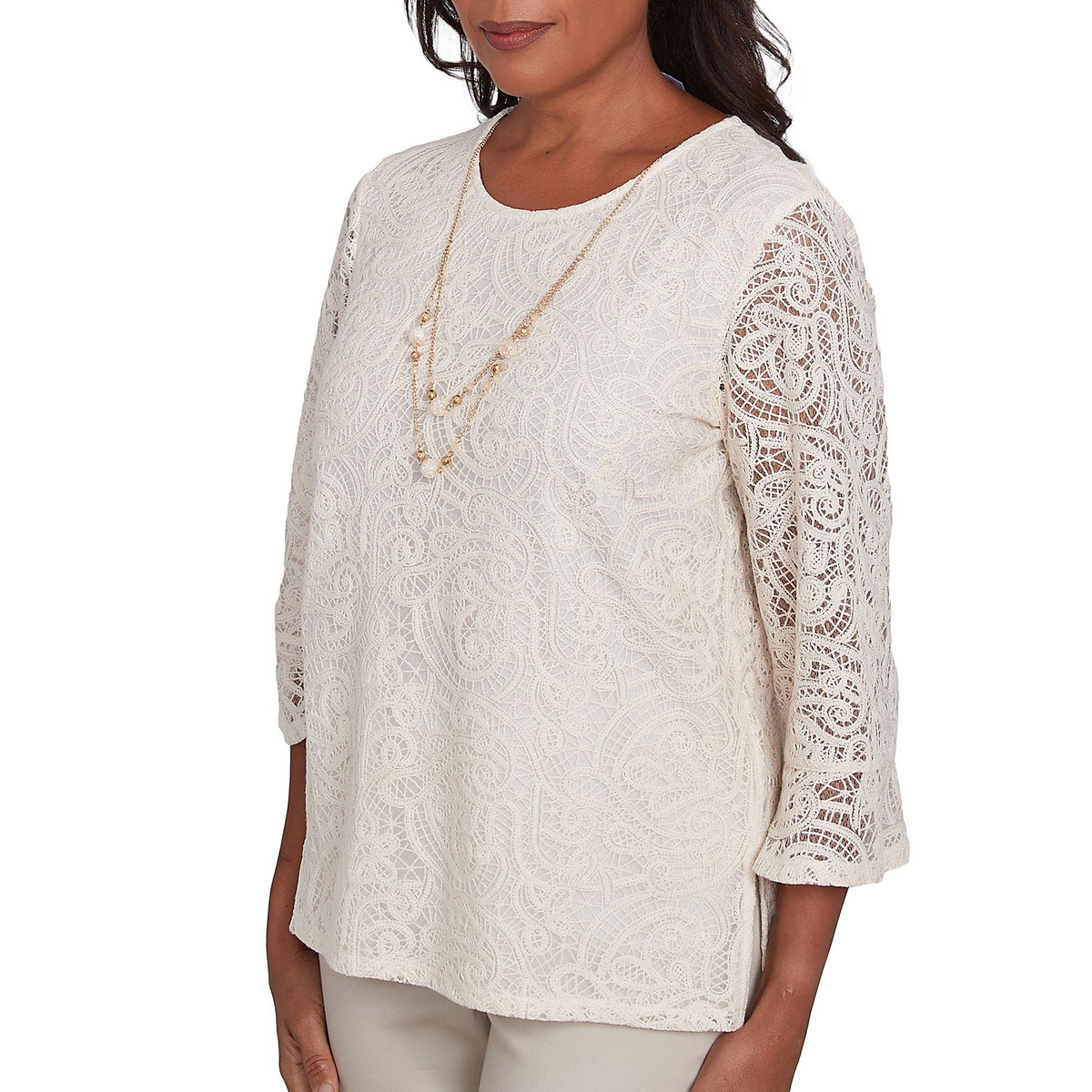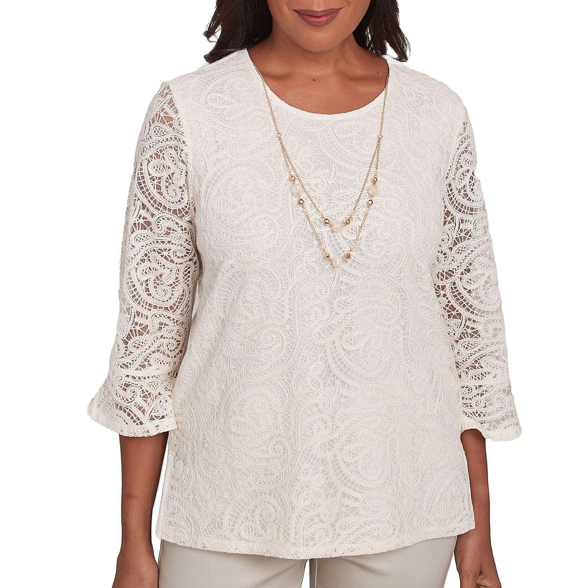 Elevate your wardrobe with this exquisite woven lace top, featuring a classic crew neckline and flattering three-quarter flared sleeves. The delicate lace pattern adds a touch of feminine charm, while the straight hemline provides a polished silhouette. This versatile top comes with a detachable necklace for added elegance. Top length is 22.5 inches.