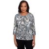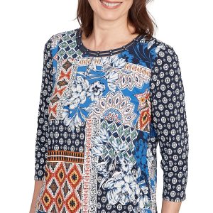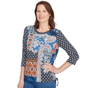 This batik patchwork top is a true fashion staple, featuring a detailed neck and three-quarter sleeves for effortless charm. The side ruching with a tie drawstring closure adds a flattering touch, making it the perfect piece to elevate your style.