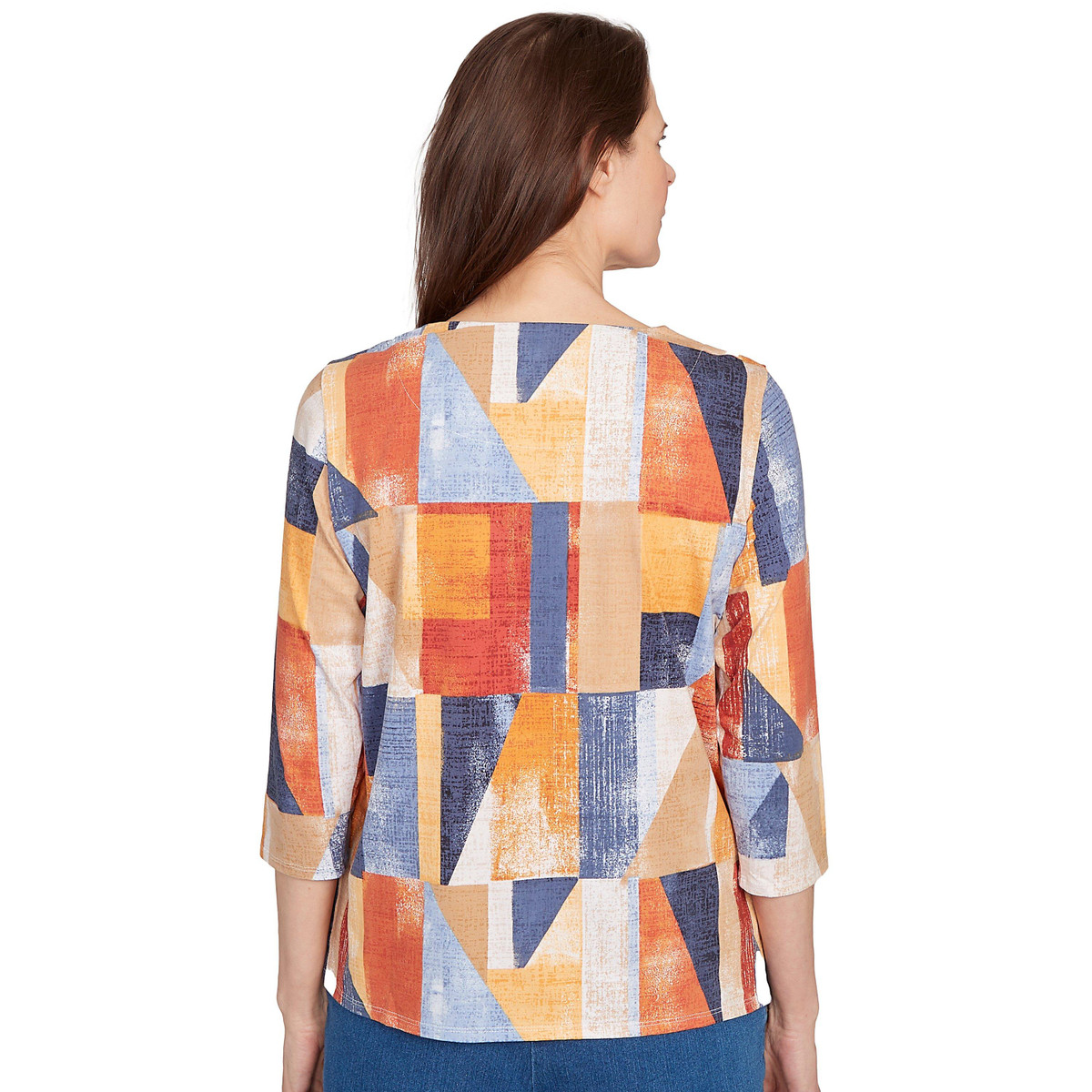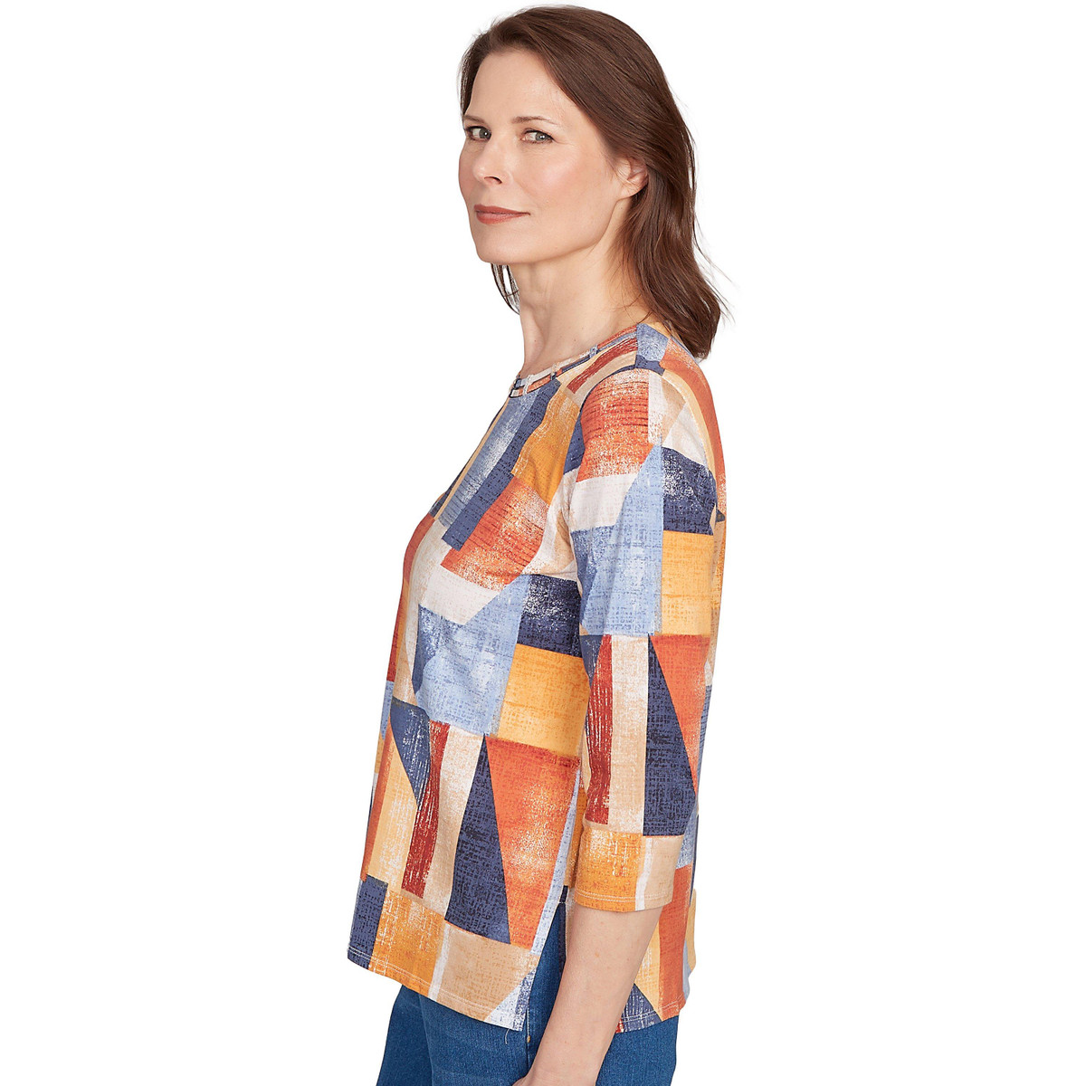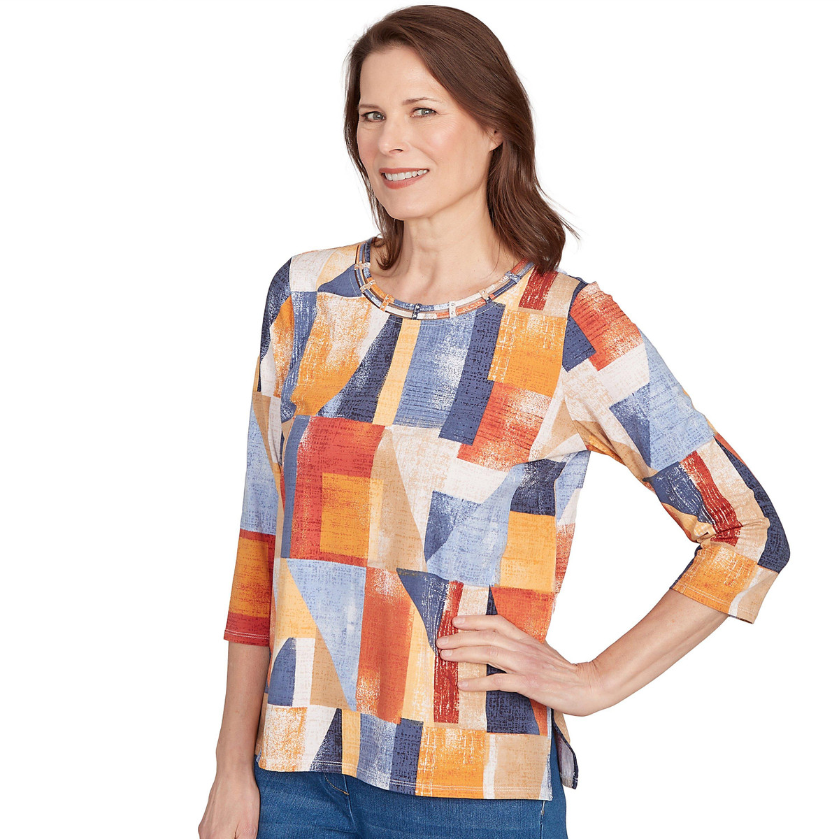 This chic colorblock top features a detailed crew neckline, three-quarter sleeves, and a straight hemline for a sleek and modern look. Perfect for effortless style with a bold touch!