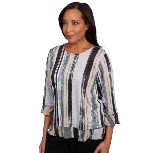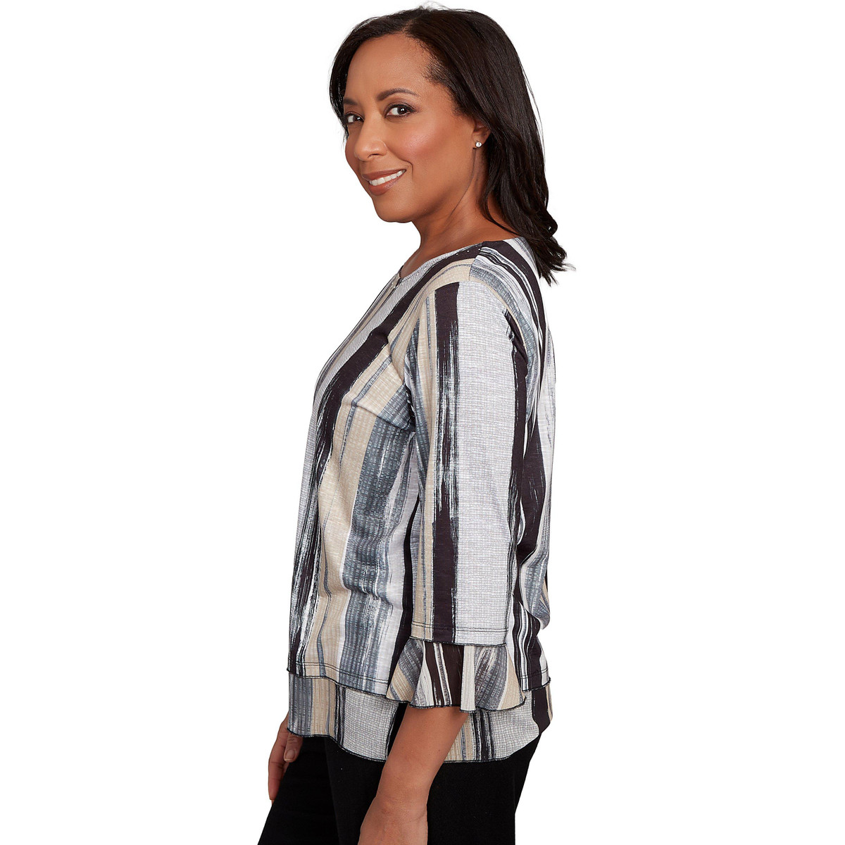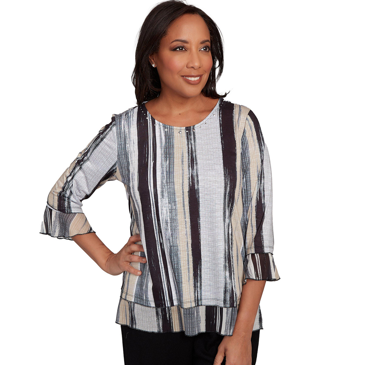 Elevate your wardrobe with this stunning top from Alfred Dunner, featuring a classic crew neckline and slightly fluttering three-quarter bell sleeves. The sophisticated etched stripe design effortlessly pairs with your favorite jeans or tailored trousers, making it a versatile choice for any occasion, from casual outings to elegant gatherings. 22 1/2-in. length from shoulder to hem.