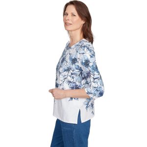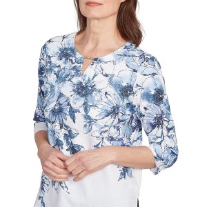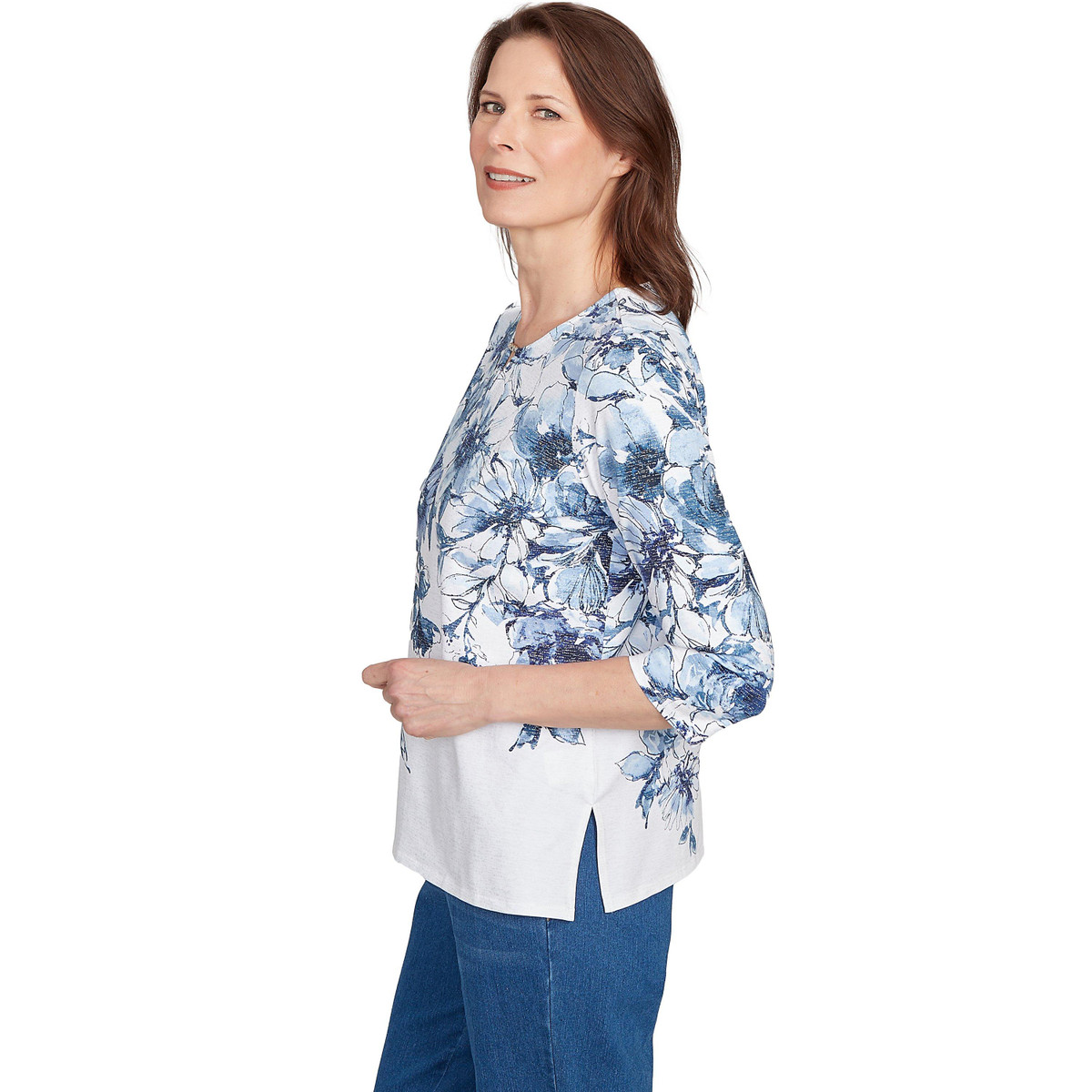 This floral neckline and border top adds a fresh, feminine touch with its beautiful floral accents at the neckline and hem. The classic crew neckline and three-quarter sleeves offer a comfortable, flattering fit for everyday wear.