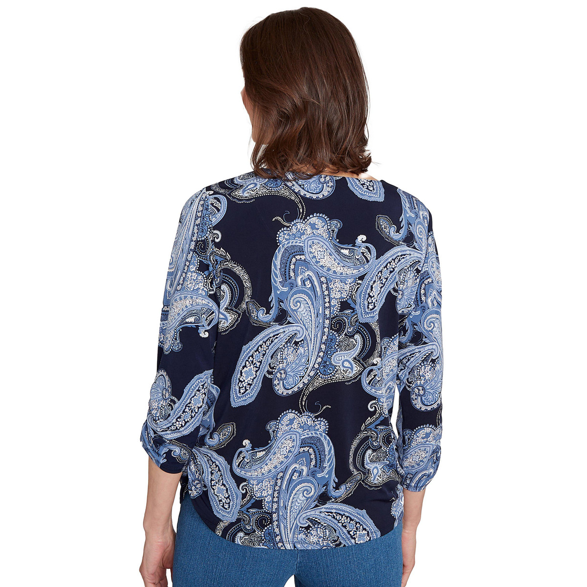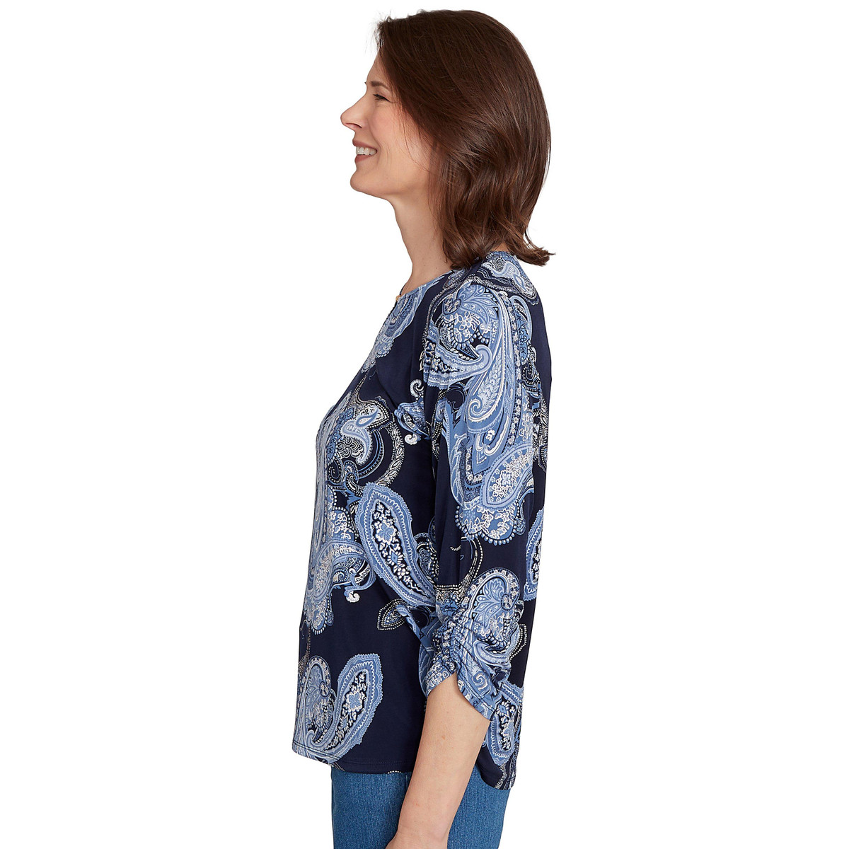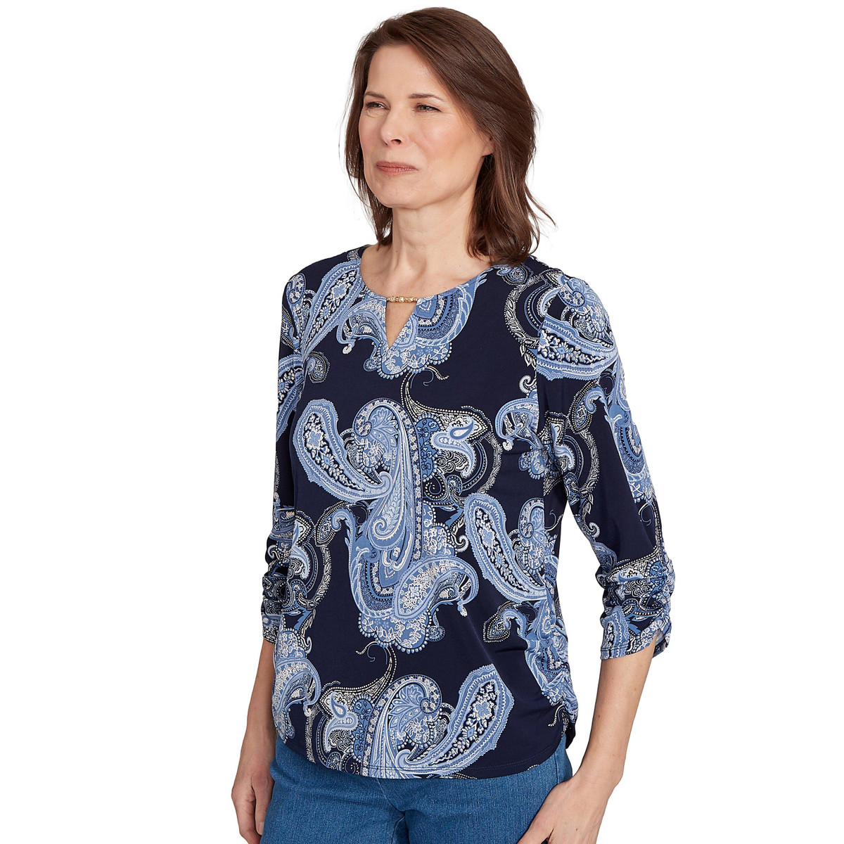 Elevate your wardrobe with this stunning paisley top from Alfred Dunner, adorned with shimmering gold foil accents that bring an air of sophistication to any ensemble. Featuring a flattering split beaded neckline and elegantly ruched three-quarter sleeves, this piece balances comfort and style, making it perfect for both casual outings and dressed-up occasions.