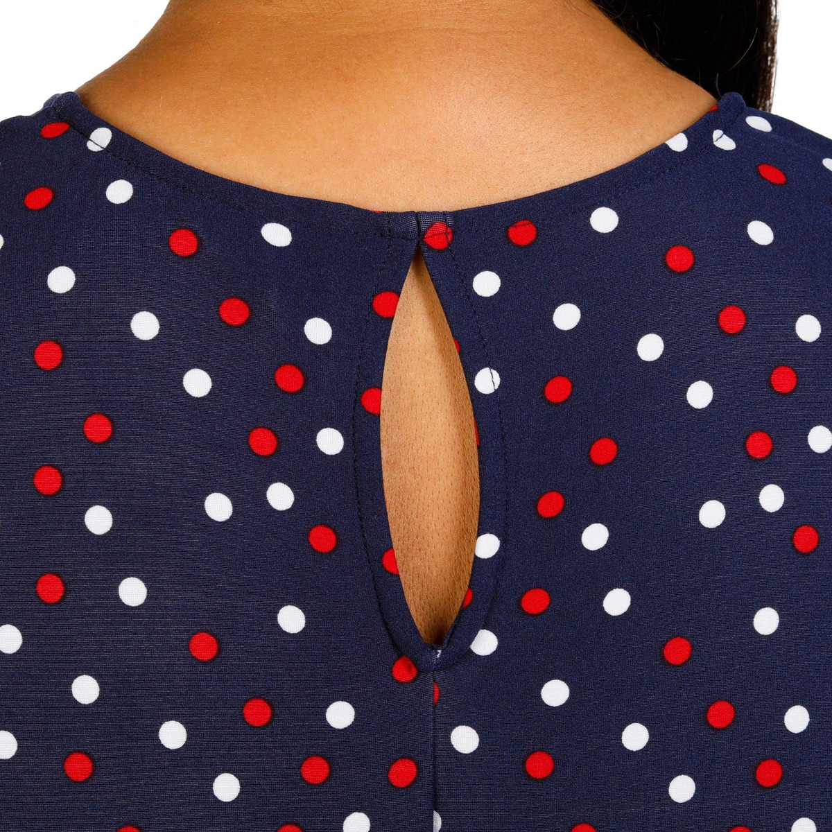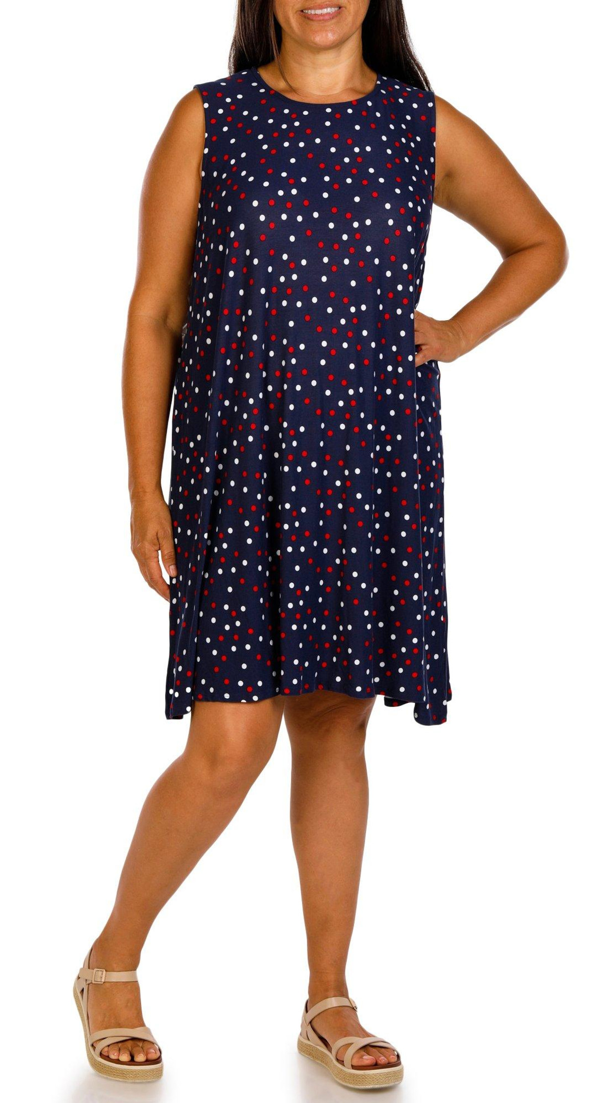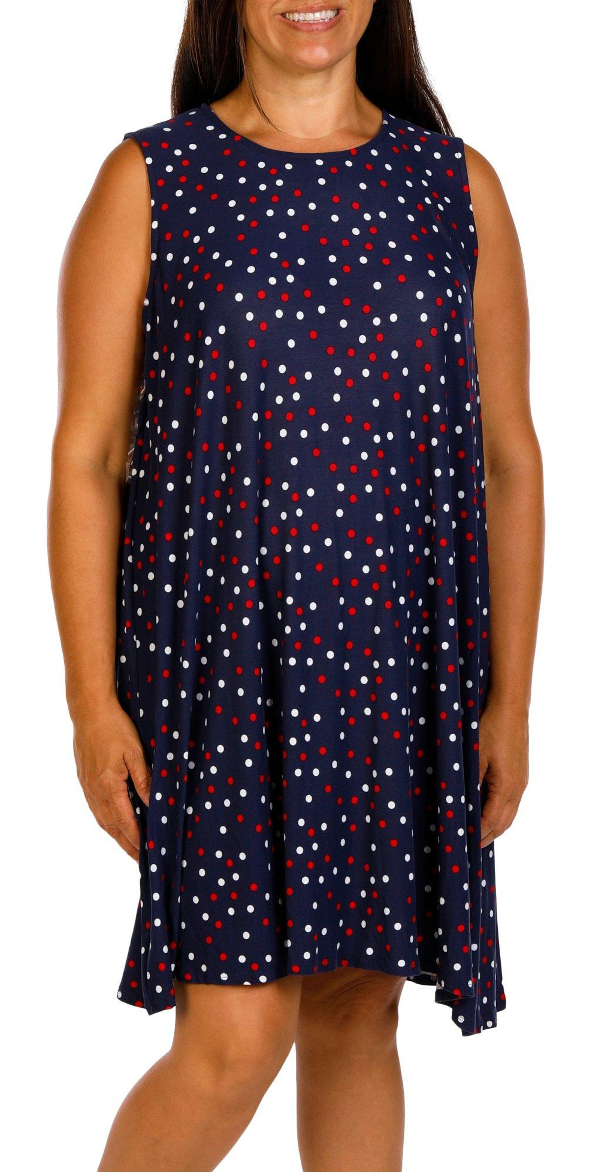 This plus size sleeveless polka dot swing dress features a classic crew neckline and a back keyhole detail for added charm. The flowing silhouette and polka dot print create a breezy and stylish look perfect for warm days or casual outings. Fabrication is 92% polyester, 8% spandex