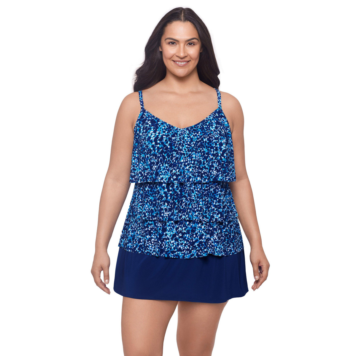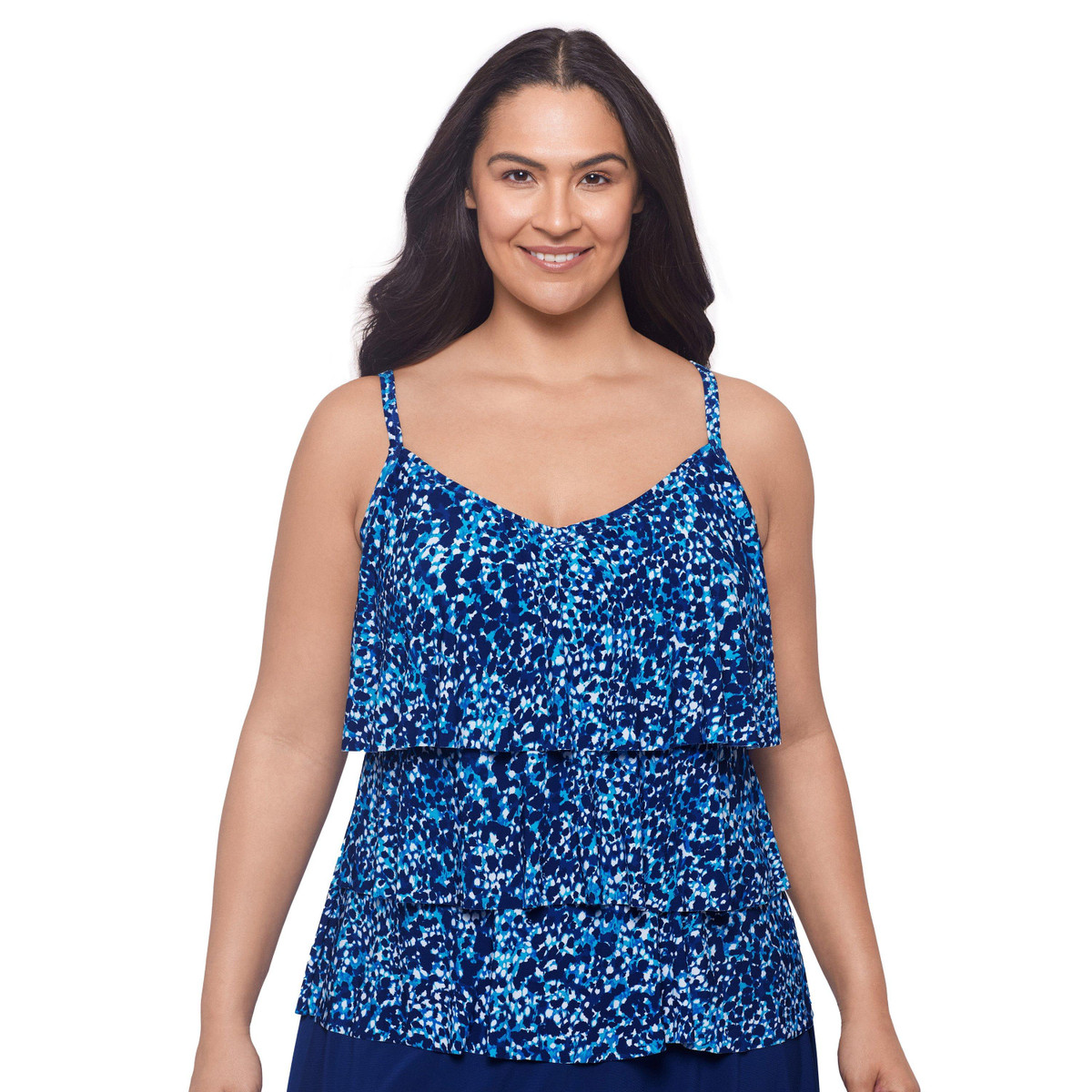 Celebrate your curves and embrace the wild side of summer with the Plus Size American Beach tankini swim top, where style meets comfort in every wave. Features v-neck style, adjustable straps, triple teir and light padding.