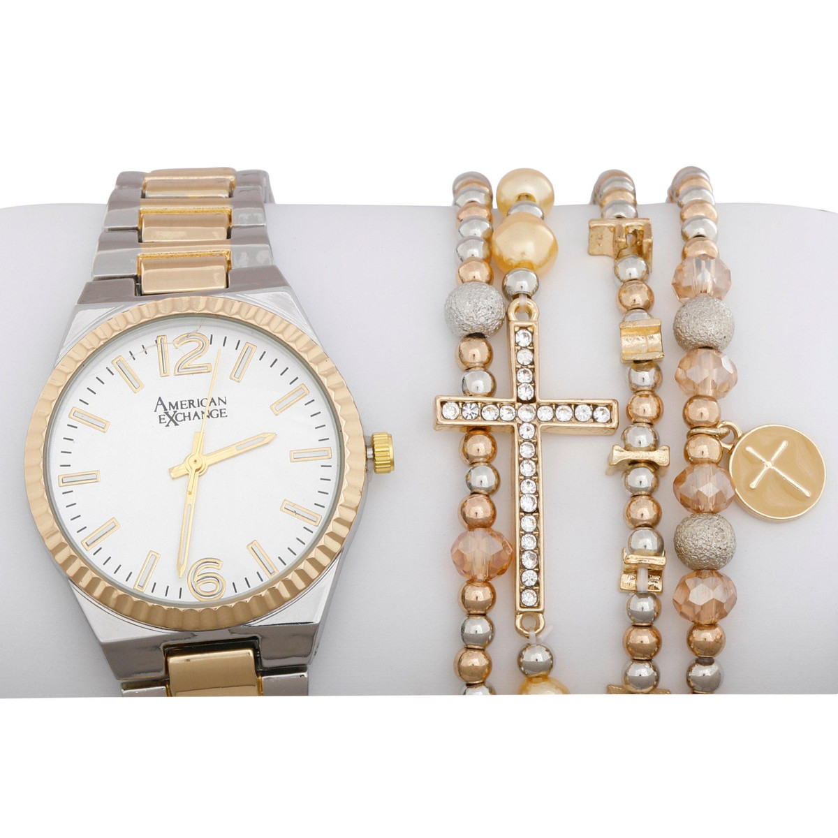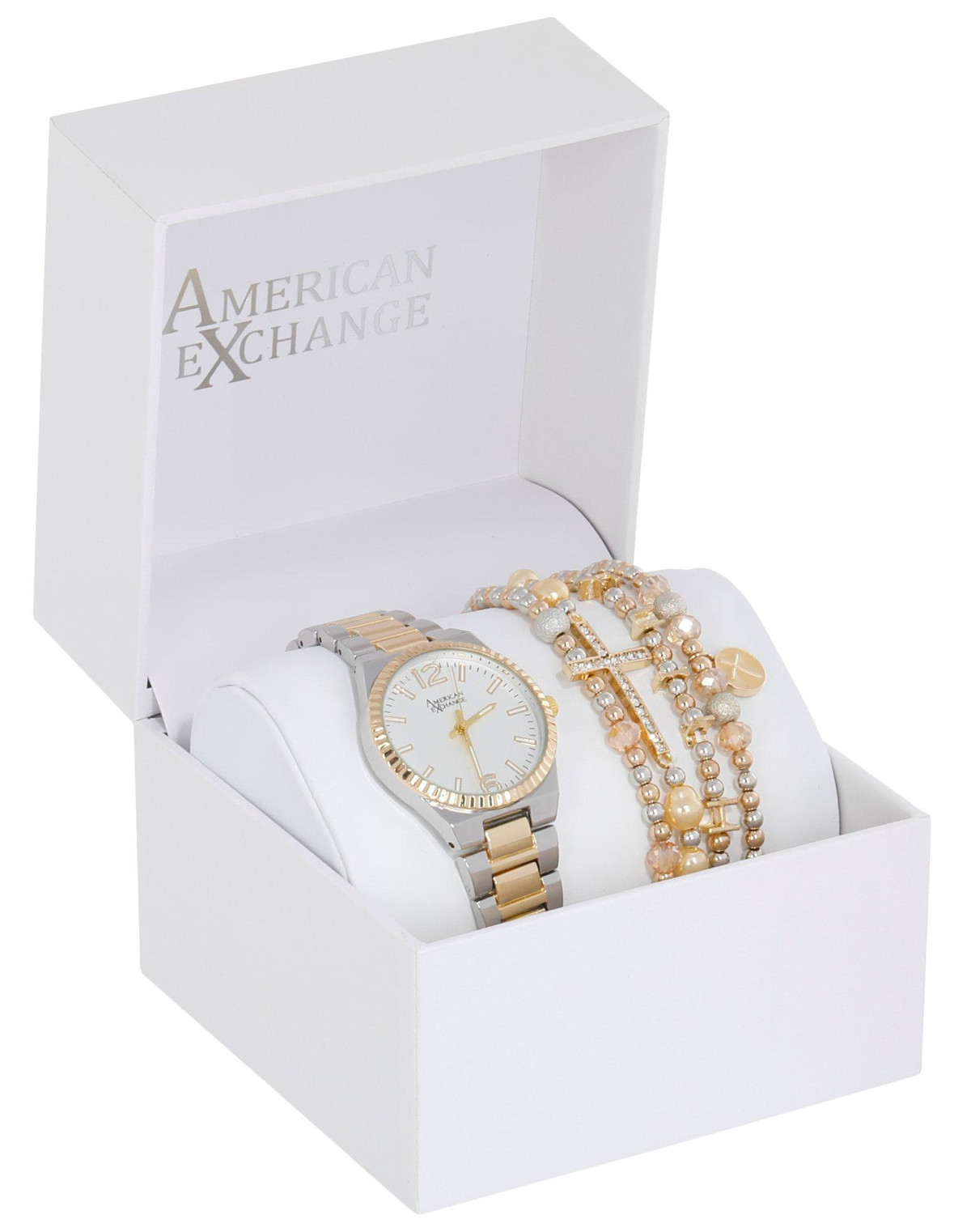 Elevate your accessory game with the American Exchange Women’s 2-Tone Boxed Watch Set. This stylish set features a sleek two-tone watch paired with coordinating bracelets, all presented in a chic gift box. Perfect for adding a touch of sophistication to any outfit or as a thoughtful gift for a loved one. Whether dressing up for a special occasion or adding flair to everyday wear, this set offers versatility and timeless appeal.