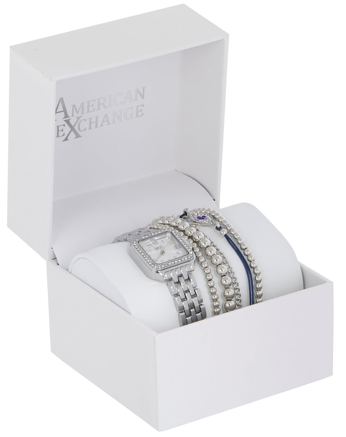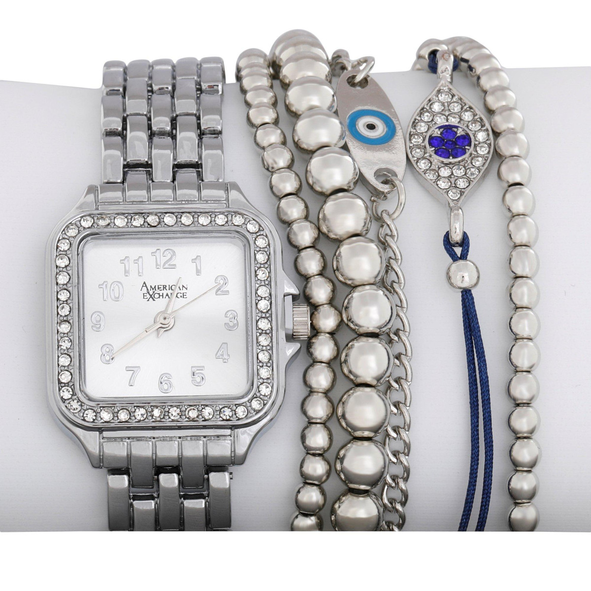 Elevate your accessory collection with the American Exchange Women’s Silver Evil Eye Boxed Watch Set. This chic set features a sleek silver-tone watch paired with coordinating bracelets, each adorned with the protective and symbolic evil eye charm. Presented in a stylish gift-ready box, it’s the perfect present for loved ones or a treat for yourself. Whether dressing up for a special occasion or adding flair to everyday wear, this set offers versatility and timeless appeal.