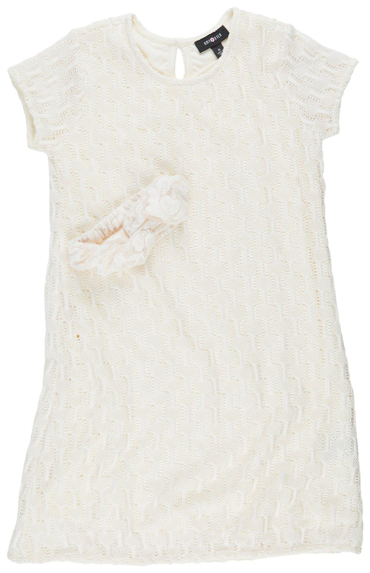 Elegant and timeless, this all-white lace dress with matching headband is perfect for special occasions. Featuring short sleeves, a round neckline, and a delicate floral embellishment, its a beautiful choice for weddings, graduations, or celebrations.