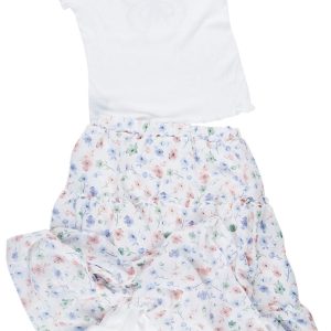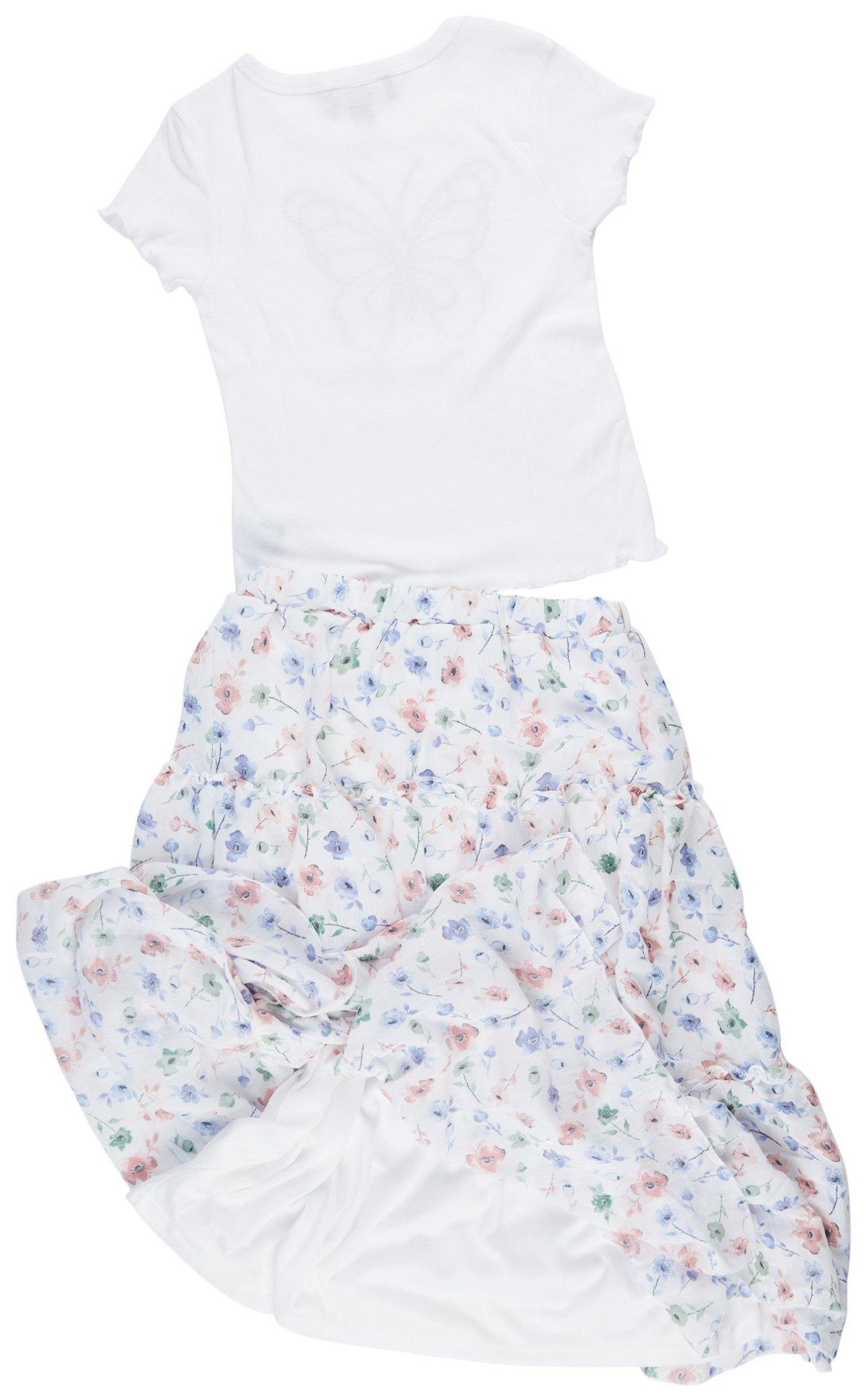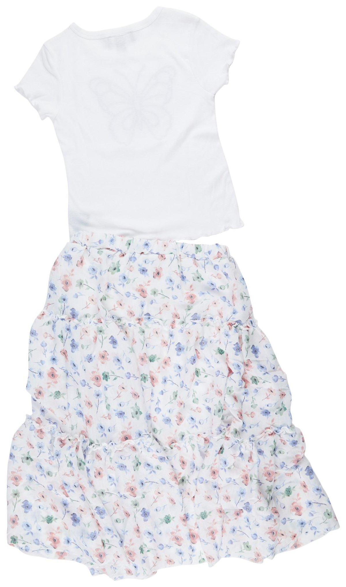 Effortlessly stylish, this 2-piece set features a soft butterfly-embroidered tee with lettuce edging and a flowy, floral tiered maxi skirt. Perfect for everyday flair or special outings, it’s comfy, cute, and ready to twirl.