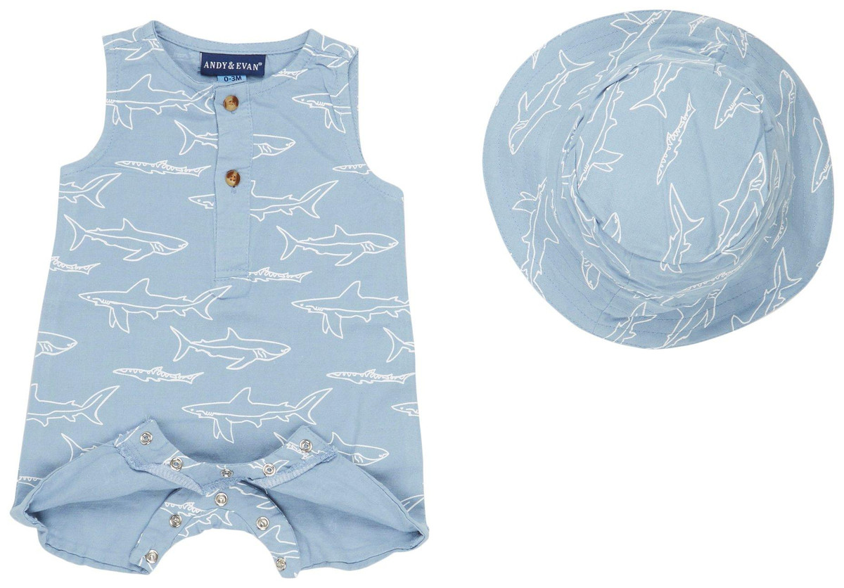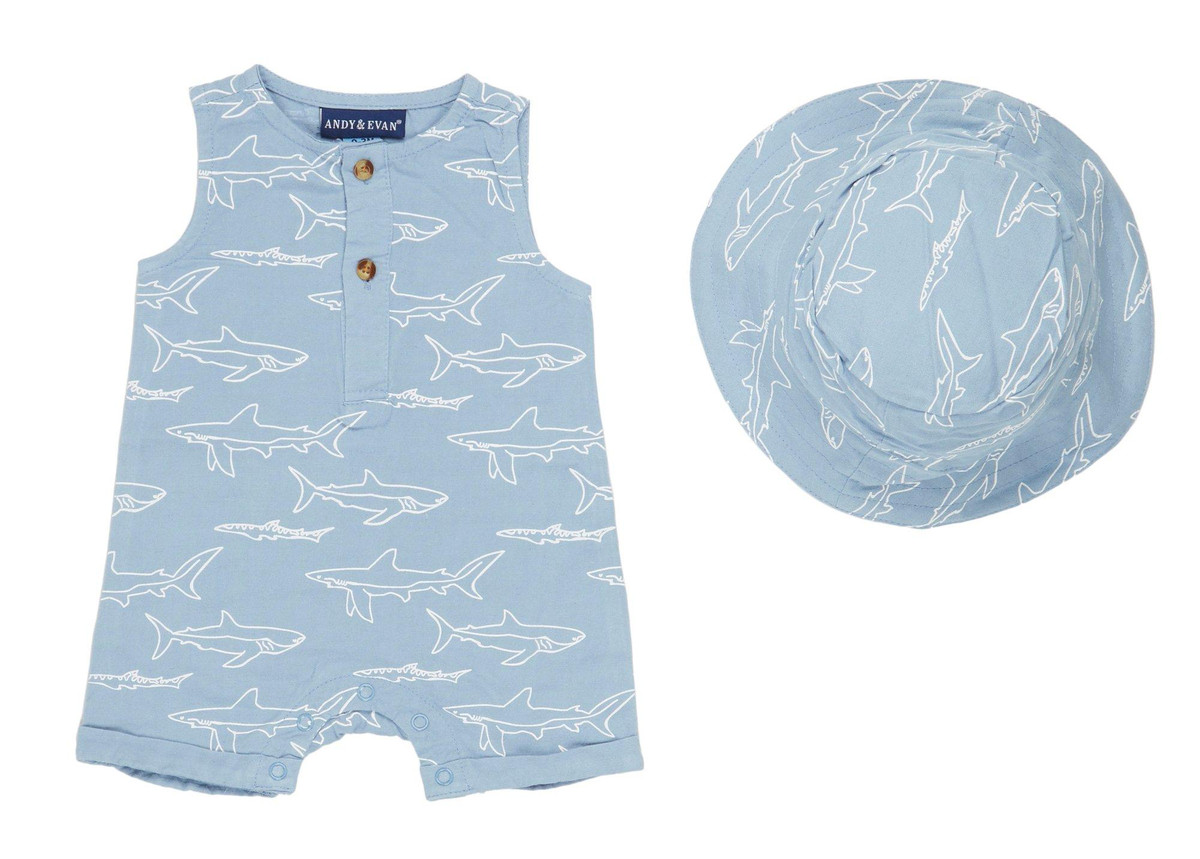 This Baby Boy Shark Romper Set is designed for cool, lightweight comfort on warm days. Made from soft, breathable fabric, it feels cool to the touch, ensuring all-day ease. The sleeveless blue romper features a fun shark print, with two front buttons and crotch snaps for easy changes. Complete with a matching bucket hat, this set is perfect for beach outings, playtime, or everyday wear.