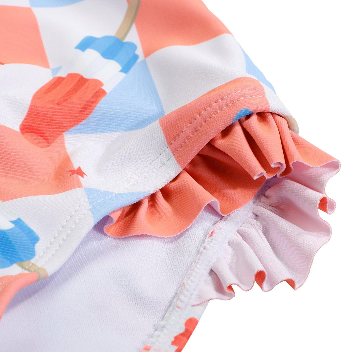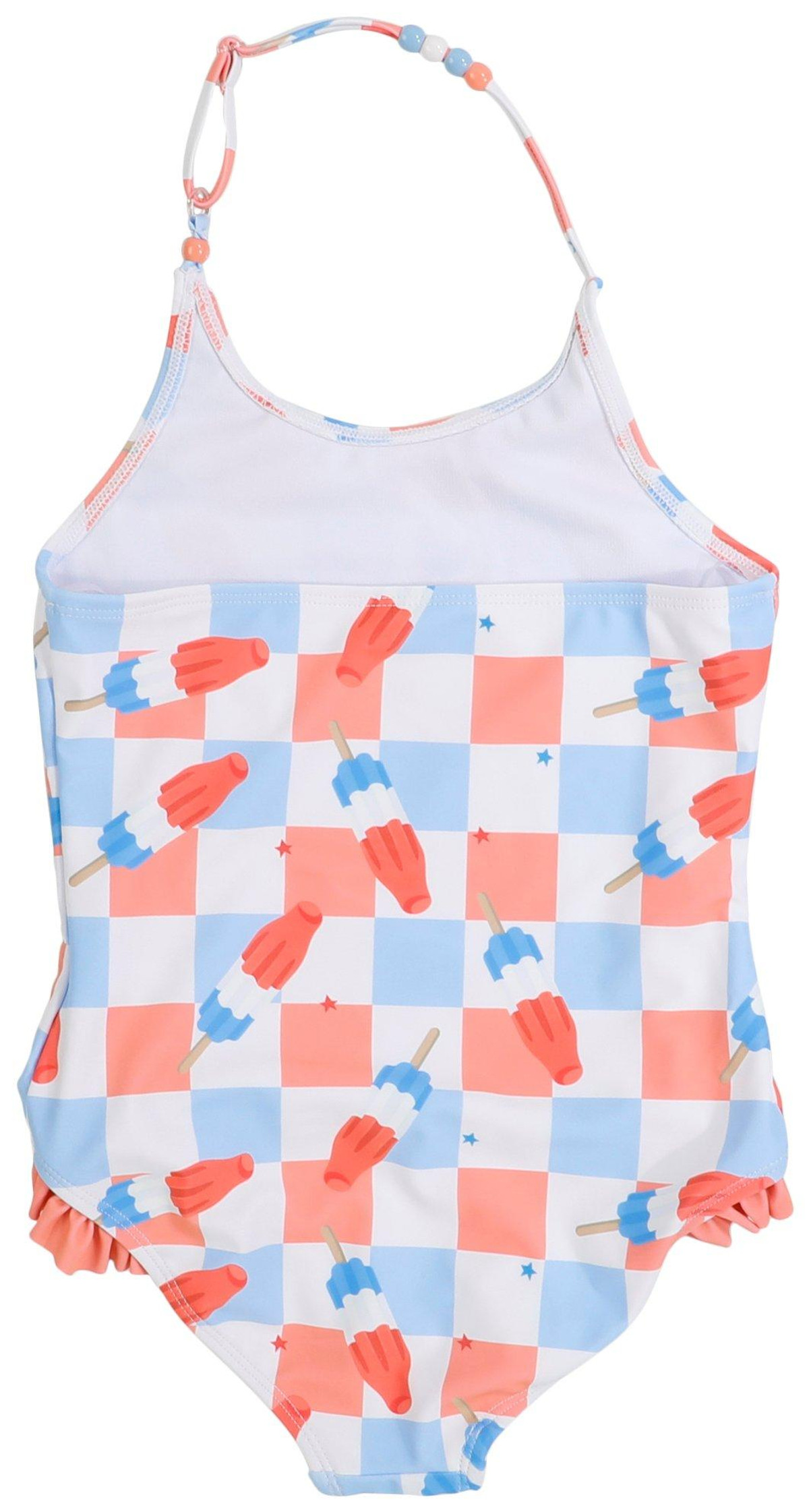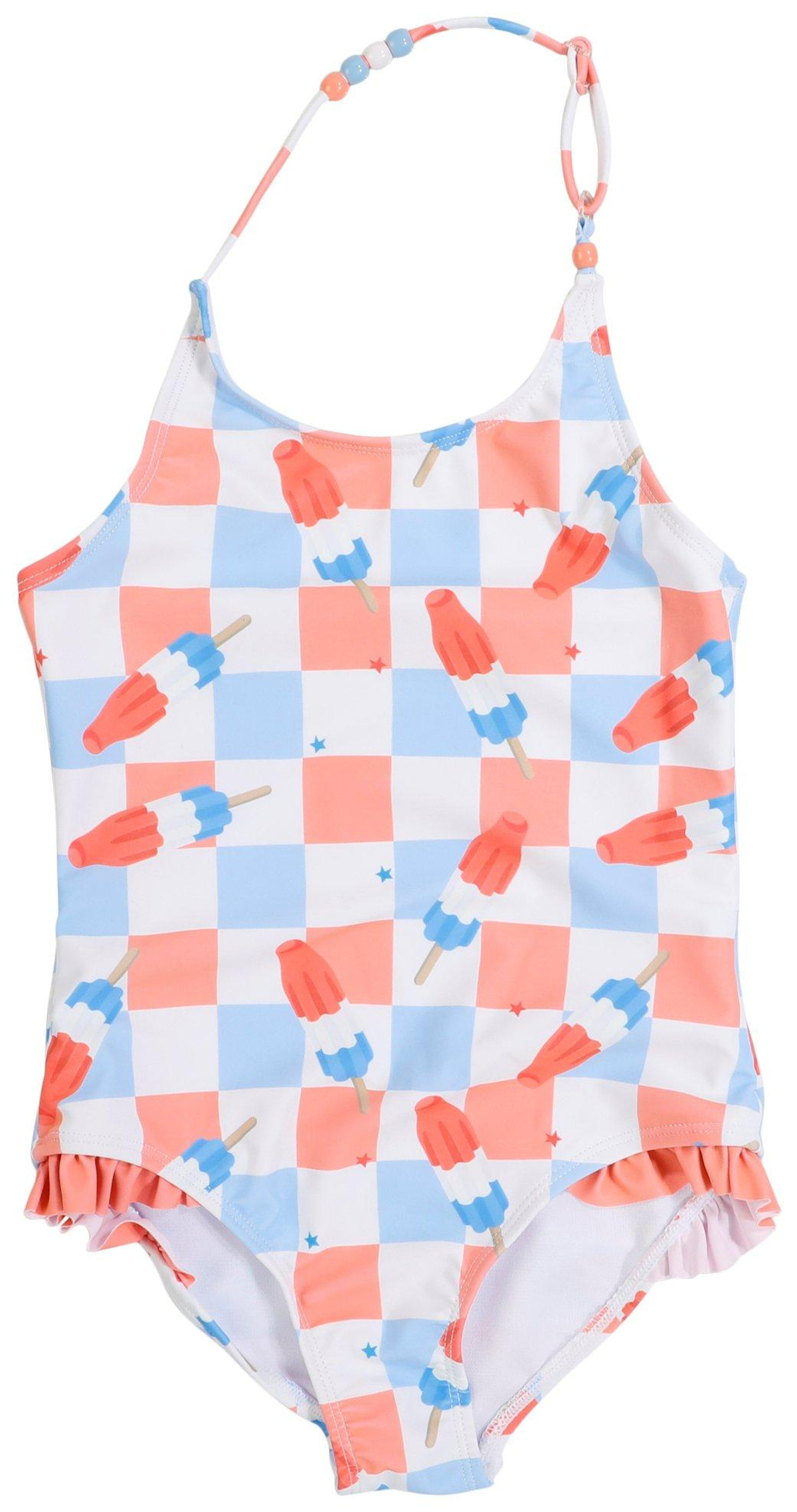 Sweeten up swim time with this popsicle-themed one-piece swimsuit! Featuring a fun, colorful pattern and playful ruffle details, this suit is perfect for sunny days at the beach or pool. Designed with comfort and style in mind, its a treat shell love to wear!. Fabric Content: Cotton/Spandex