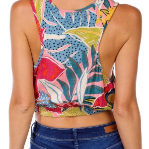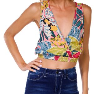 Feel the sunshine on your skin and the breeze in your hair with the Juniors Sleeveless Floral Crop V-Neck Topa piece that embodies carefree confidence and effortless charm. The flattering V-neck and cropped silhouette create a look thats both breezy and bold, perfect for those who embrace every moment with energy and grace. Adorned with a vibrant floral print, this top is a celebration of color, movement, and the joy of summer days.