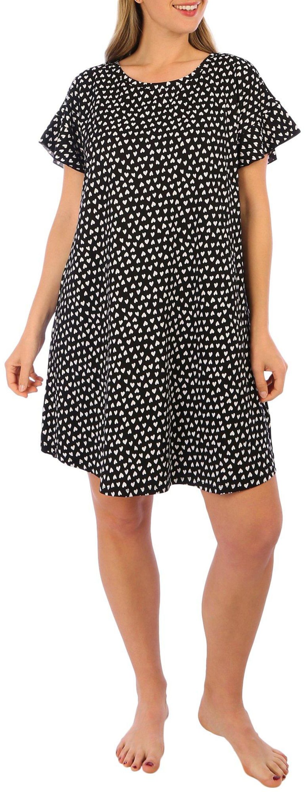 Stay cozy in our Short Sleeve Heart Print Sleep Dress! Made from a blend of polyester and spandex, this pajama dress features a cute all-over heart print, short sleeves and crew neckline. Length is 35 inches.