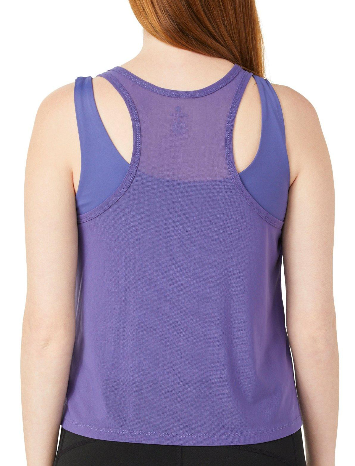 The Womens Active 2Fer Sport Tank Top delivers layered style and support in one sleek design. Featuring a solid color with a mesh exterior, it includes an inner tank with an internal shelf bra for added comfort. A crew neckline and performance stretch fabric ensure a secure fit and full range of motion. Fabrication 90% nylon, 10% spandex.