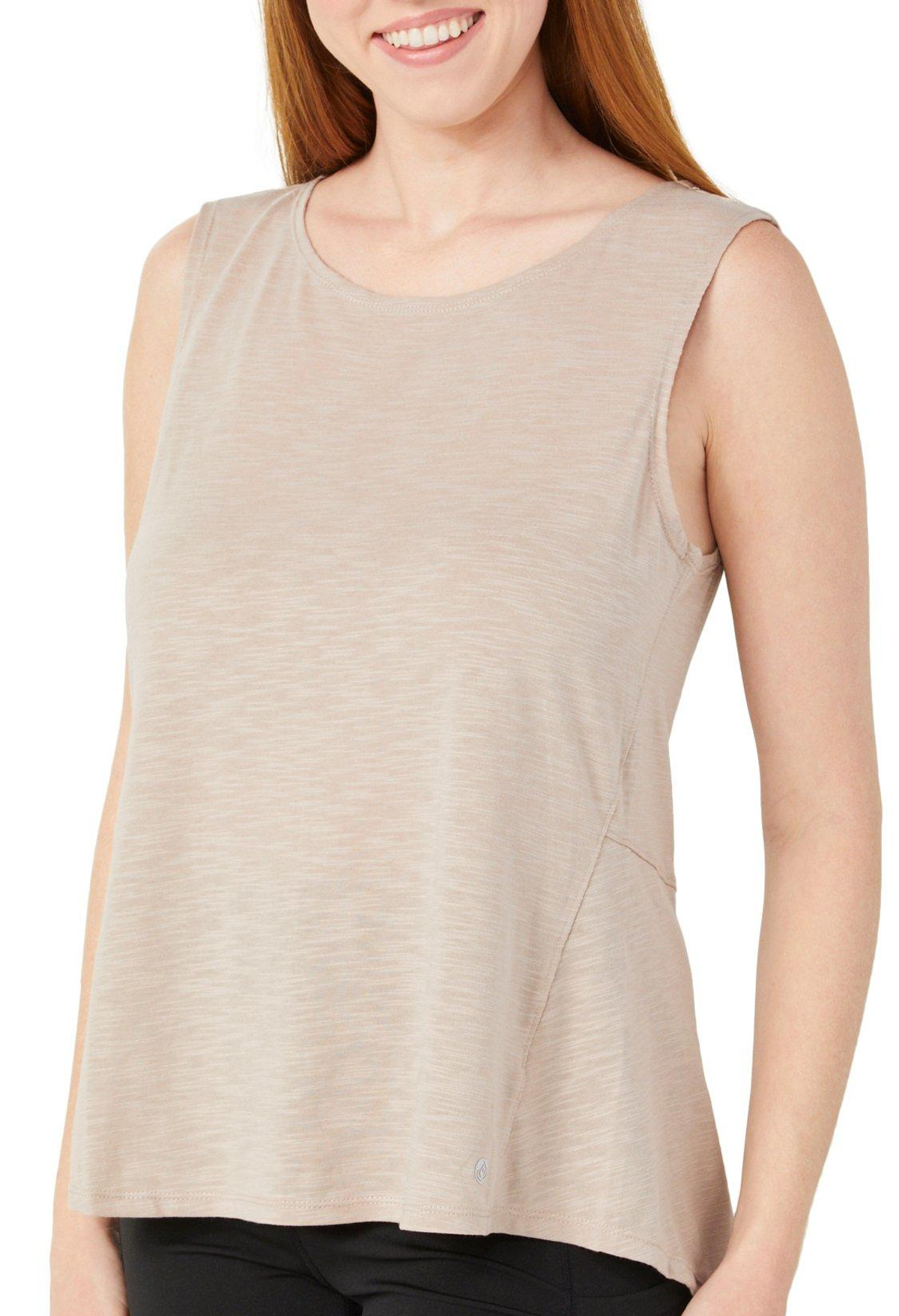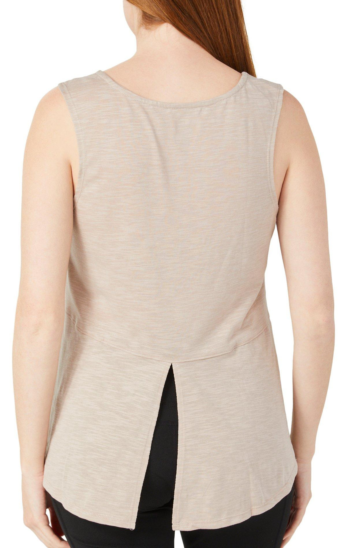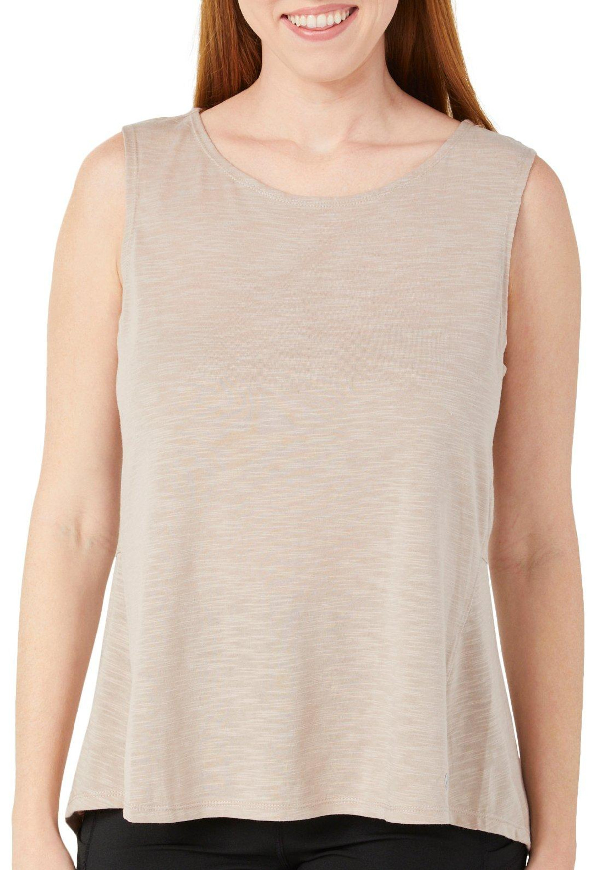 The Womens Active Composure Back Slit Tank Top offers a relaxed yet refined look with a heathered exterior and classic crew neckline. A back slit hem adds a touch of style and breathability, making it perfect for both active days and casual wear. Fabrication 65% polyester, 35% cotton.