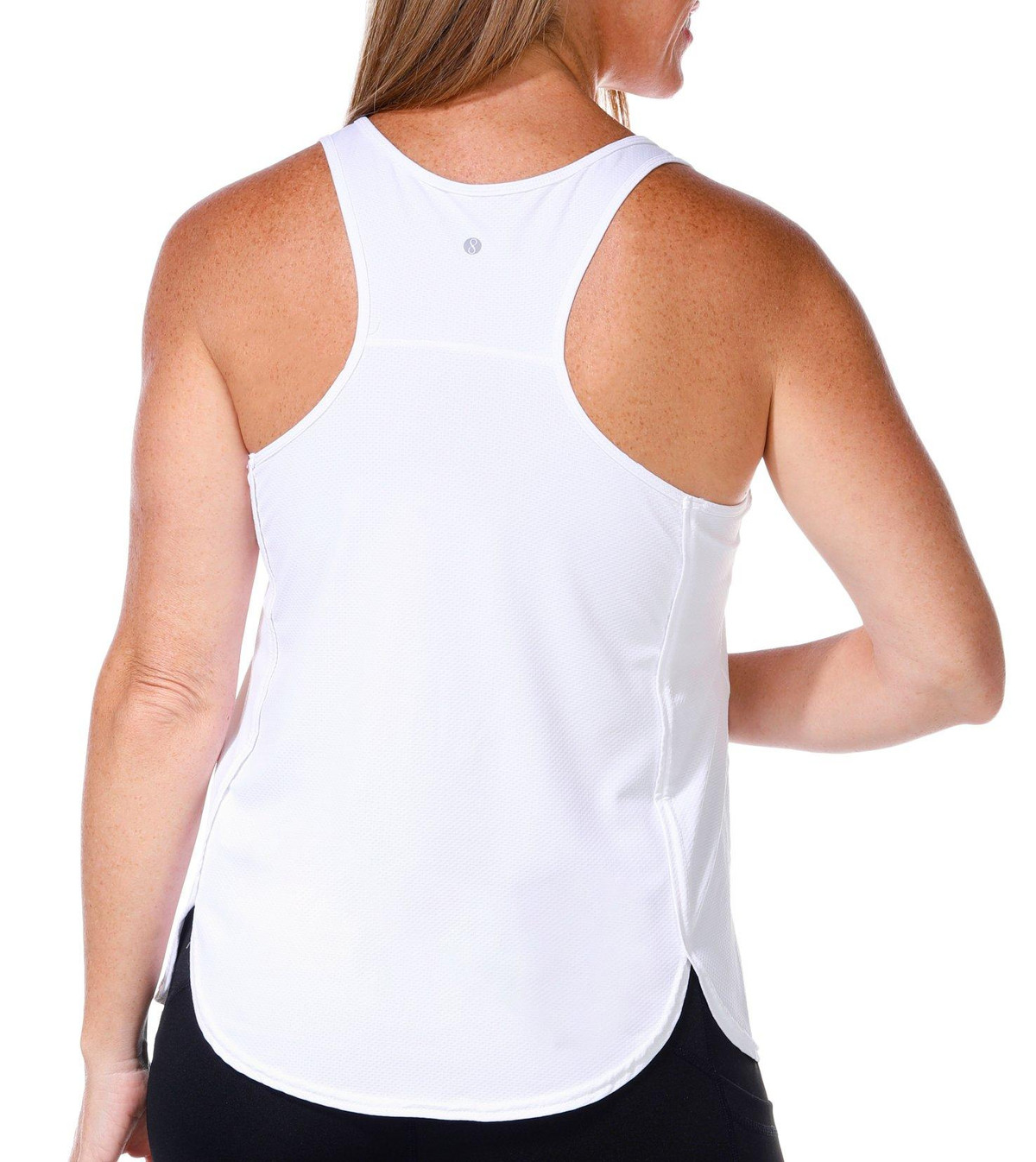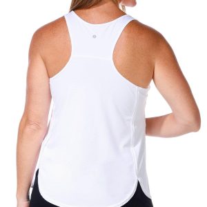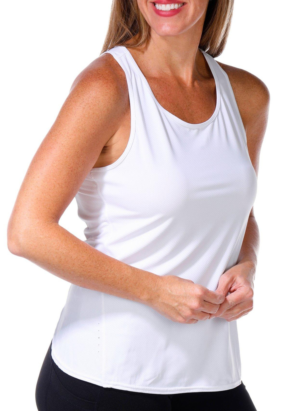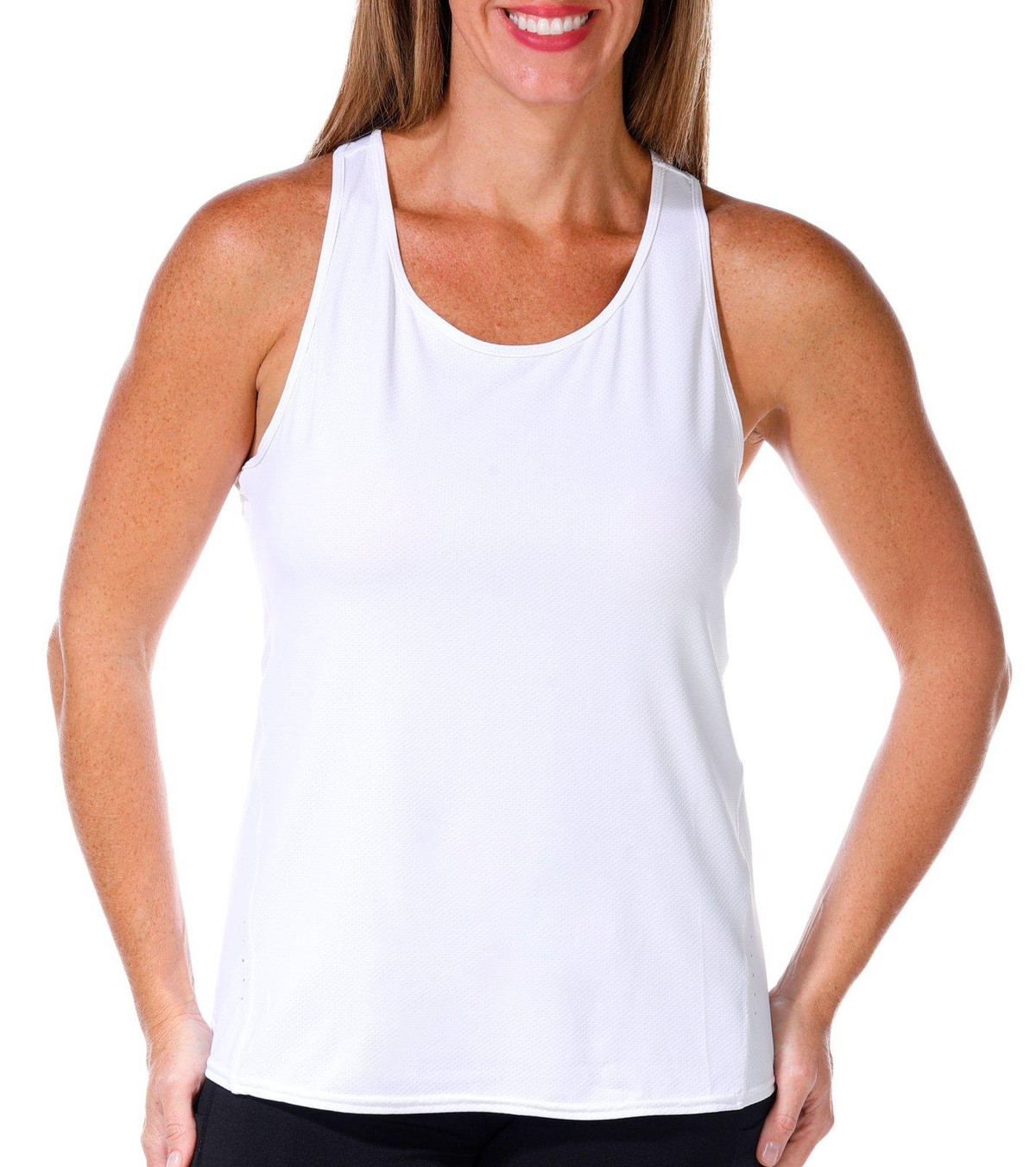 Stay cool and confident in the Womens Active Fly Away Run Tank Top. Designed with a scoop neckline and racer back, this solid color tank offers quick dry fabric and performance stretch for all day comfort. Perfect for workouts or casual wear, it moves with you while keeping you dry and stylish. Fabrication 83% polyester, 17% spandex.