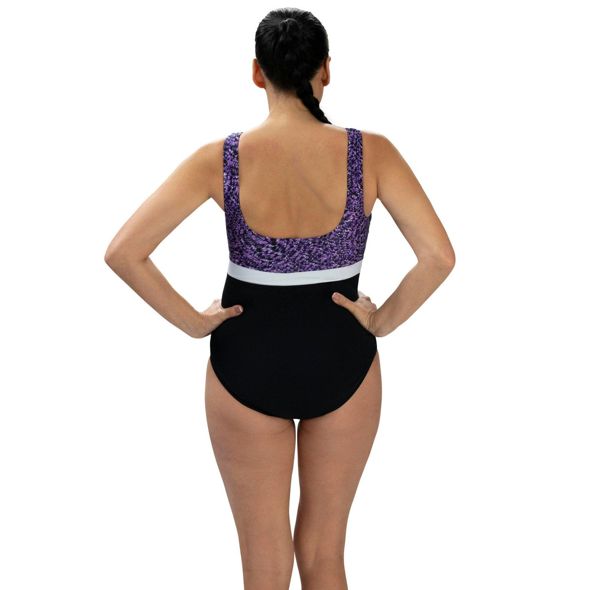 Dive into performance and style with this sleek color block swimsuit. Made from 100% polyester, it resists chlorine and pilling for long-lasting wear. A built-in shelf bra with sewn-in cups offers all-day support, while the scoop back ensures freedom of movement. Designed for a snug, athletic fit, its perfect for powering through training sessions or enjoying a day at the pool.