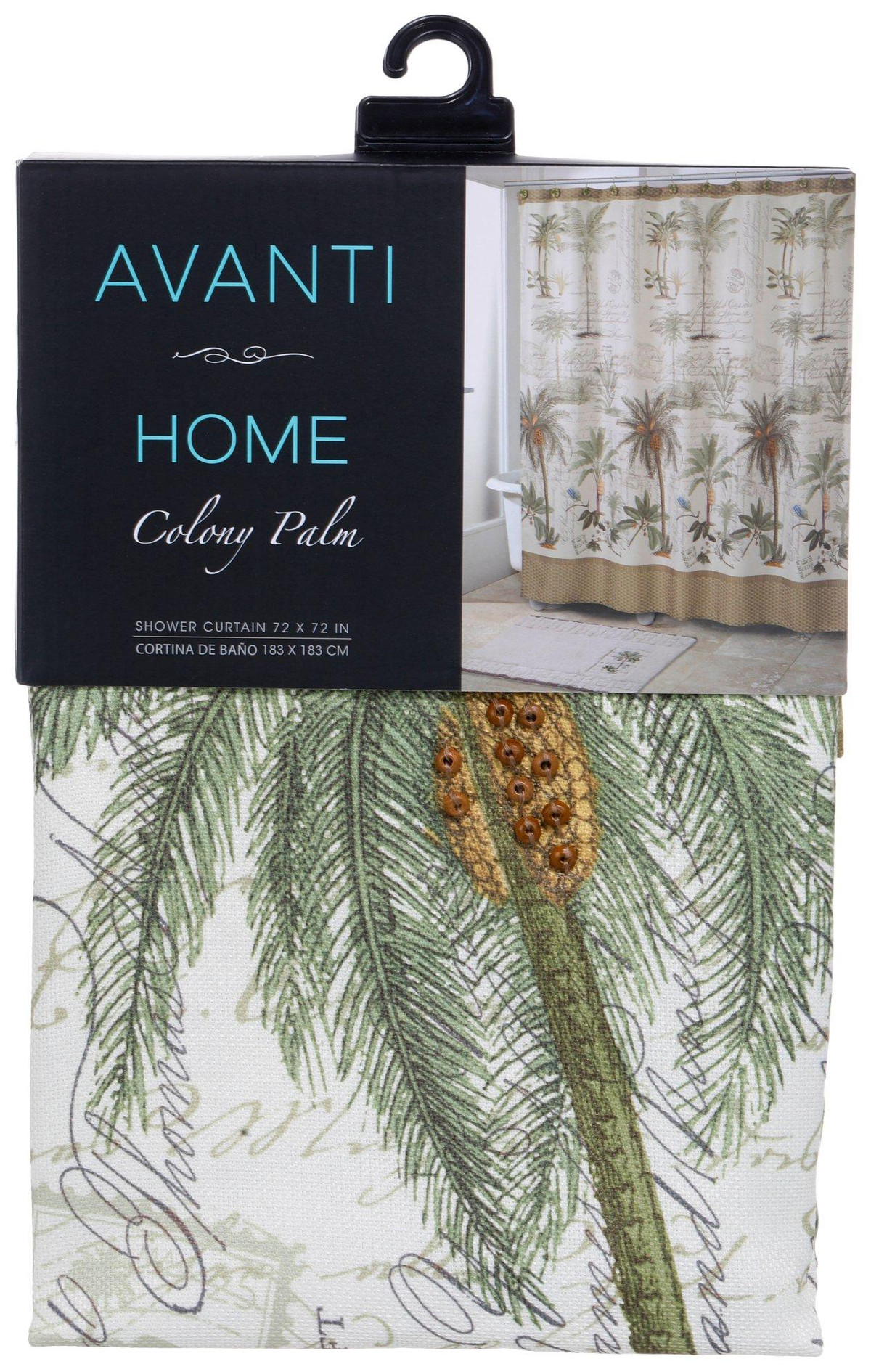 The tropical motif and soothing neutrals of the Colony Palm shower curtain brings stylish ease to your bathroom, featuring palm tree accents, script and textured details. Measures 72 in. L x 72 in. W.