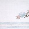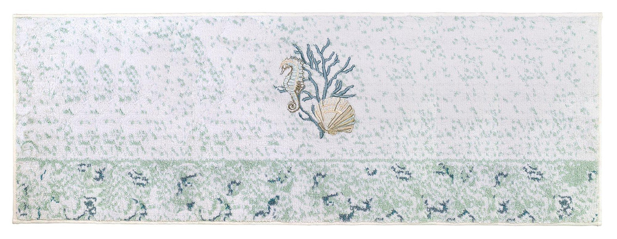 The Avanti Coastal Terrazzo rug is tufted in 100% cotton and embroidered with a nautilus and starfish. The rug has a white center and aqua border top and bottom. This oversized rug is skid resistant and machine washable. Measures 24 in x 60 in.