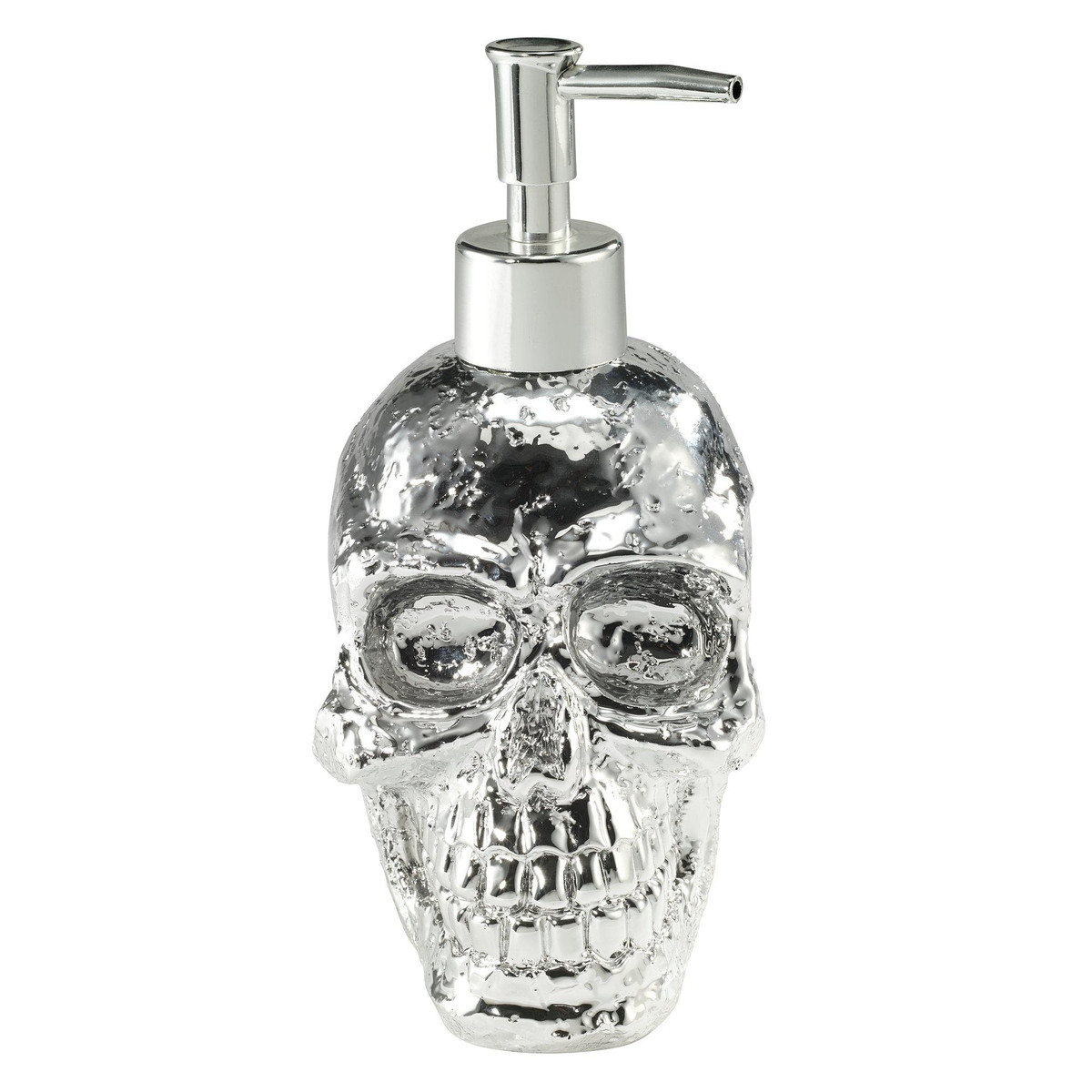 The Avanti Electroplated Skull Decorative Lotion/ Soap/ Sanitizer Dispenser is a figural skull with a shiny, textured electroplated finish and shiny silver pump. Made of durable, hand-painted resin, 5.1L x 3.4W x 6.9H. Brings a bit of Halloween spirit to any bathroom or kitchen.